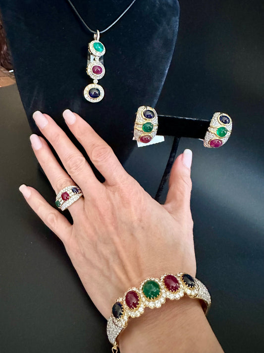 80's Vintage Cabochon Emerald, Sapphire, Rubies and Diamond Set 18k Yellow Gold