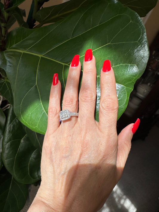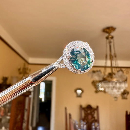 No Heat Teal Sapphire & Diamond Halo Ring 18k White Gold
