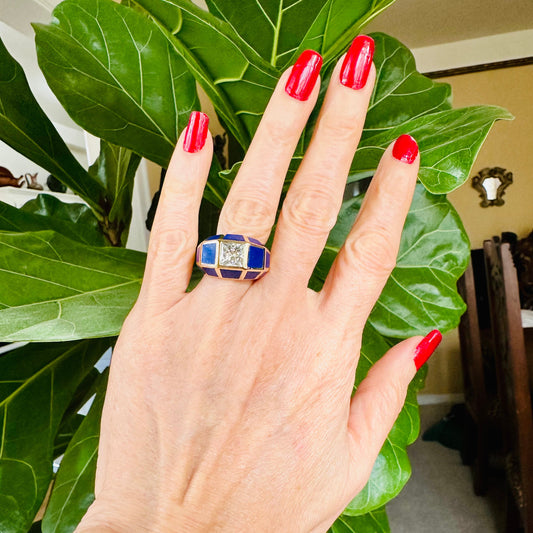 Vintage Princess Cut Diamond and Lapis Ring 14k Yellow Gold