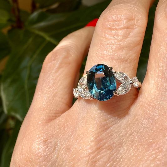 No Heat Teal Sapphire & Diamond Ring 18k White Gold