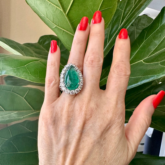 Pear Shape Cabochon Emerald Diamond Halo Ring 18k White Gold