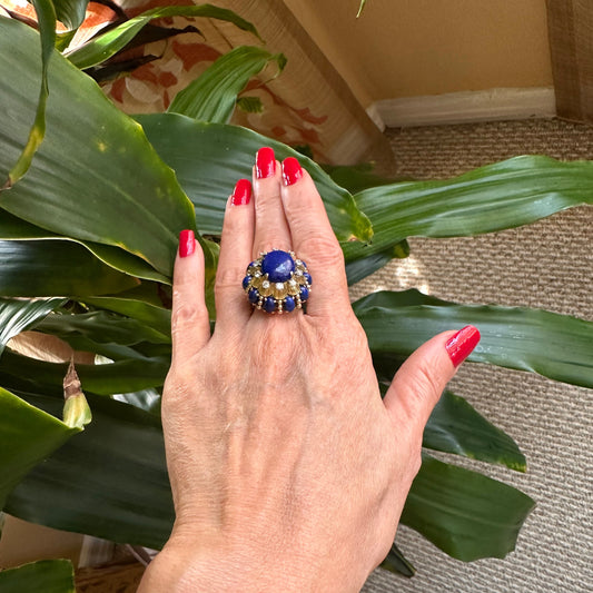 Retro 14k Lapis & Diamond Yellow Gold Ring, Vintage Lapis & Diamond 18k Ring