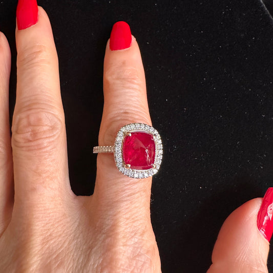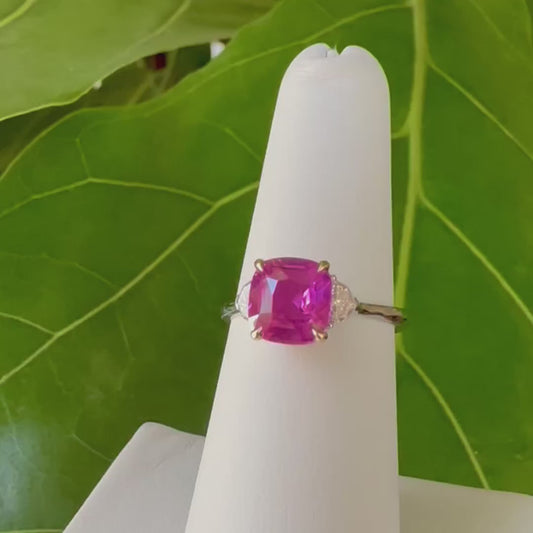 Natural Pink Sapphire & Diamond Ring Platinum & 18k, Vivid Purplish Pink Sapphire, Cushion Cut Sapphire