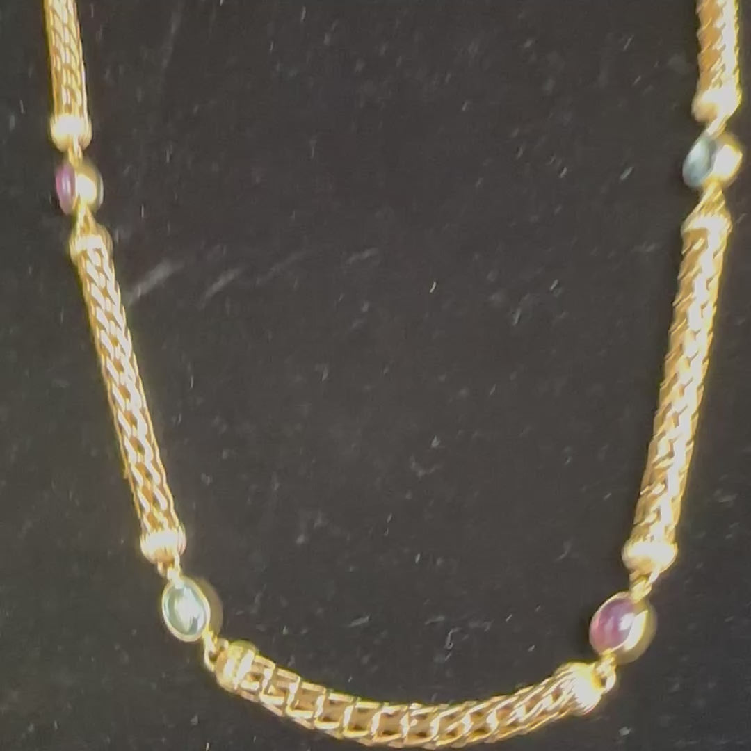 This timeless station necklace showcases the natural beauty of precious cabochon stones, each expertly bezel set along an elegant braided design. Crafted from solid 18k yellow gold, this piece is built to last—substantial and durable, never flimsy. The strategic spacing of each stone creates a sophisticated focal point that draws the eye while maintaining versatility. Whether paired with casual wear or formal attire, this statement necklace transcends trends and seasons, making it an essential addition to any jewelry collection. A refined investment piece that complements every wardrobe.