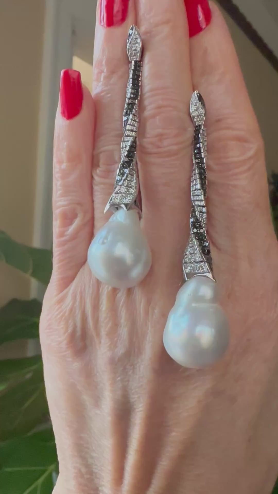 These exceptional South Sea baroque pearl earrings showcase a unique twisted design accented with both white and black diamonds holding the pearl at the base, creating a striking contrast that enhances the pearls' natural beauty. Expertly crafted, this rare pair offers a sophisticated blend of organic elegance and modern luxury, making them a truly one-of-a-kind treasure. Ideal for collectors and connoisseurs, these earrings promise to elevate any collection with their distinctive charm and timeless appeal.