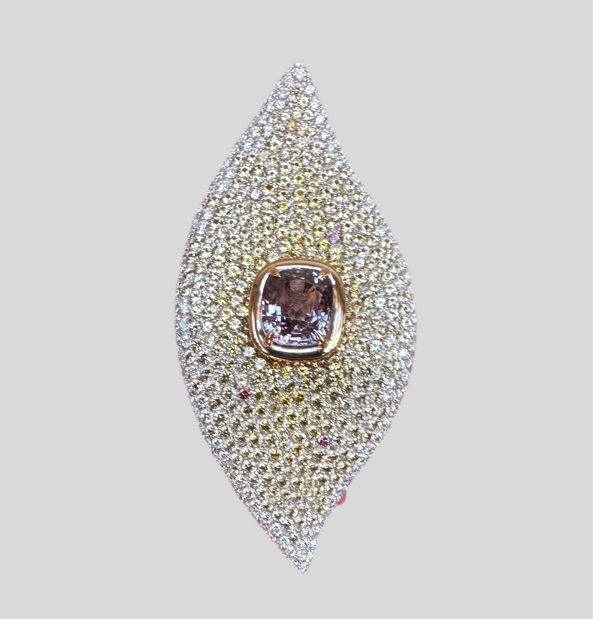 This exquisite ring by Carlo Palmiero ring features a GIA certified pinkish purple spinel at its heart, surrounded by a dazzling array of vibrant yellow and pink precious stones as well as sparkling white diamonds. With excellent craftsmanship and a love for color, this ring is a true masterpiece, perfect for those who seek rare and unique gems.