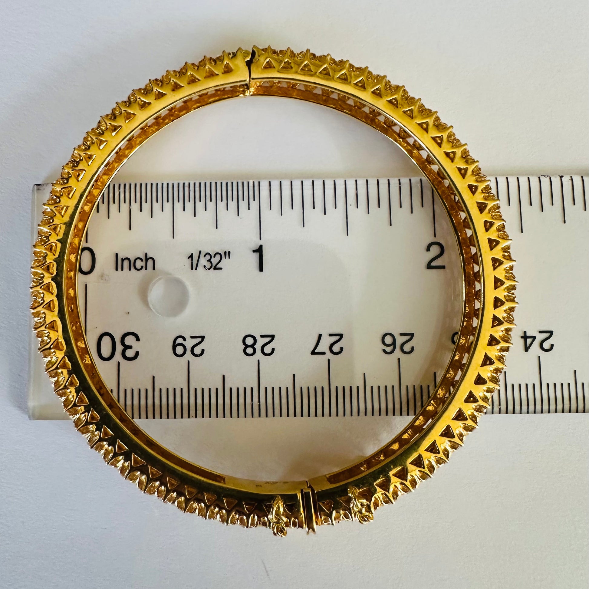 This stunning double-row diamond bangle showcases 6.84 carats of natural diamonds graded F-G VS, set in lustrous 18k yellow gold. Weighing 33.4 grams, the bracelet combines exceptional craftsmanship with refined elegance. The smooth, comfortable design ensures effortless everyday wear while delivering the sophisticated sparkle of premium diamonds. A timeless investment piece that transcends trends and rewards the discerning collector with enduring beauty and lasting value.