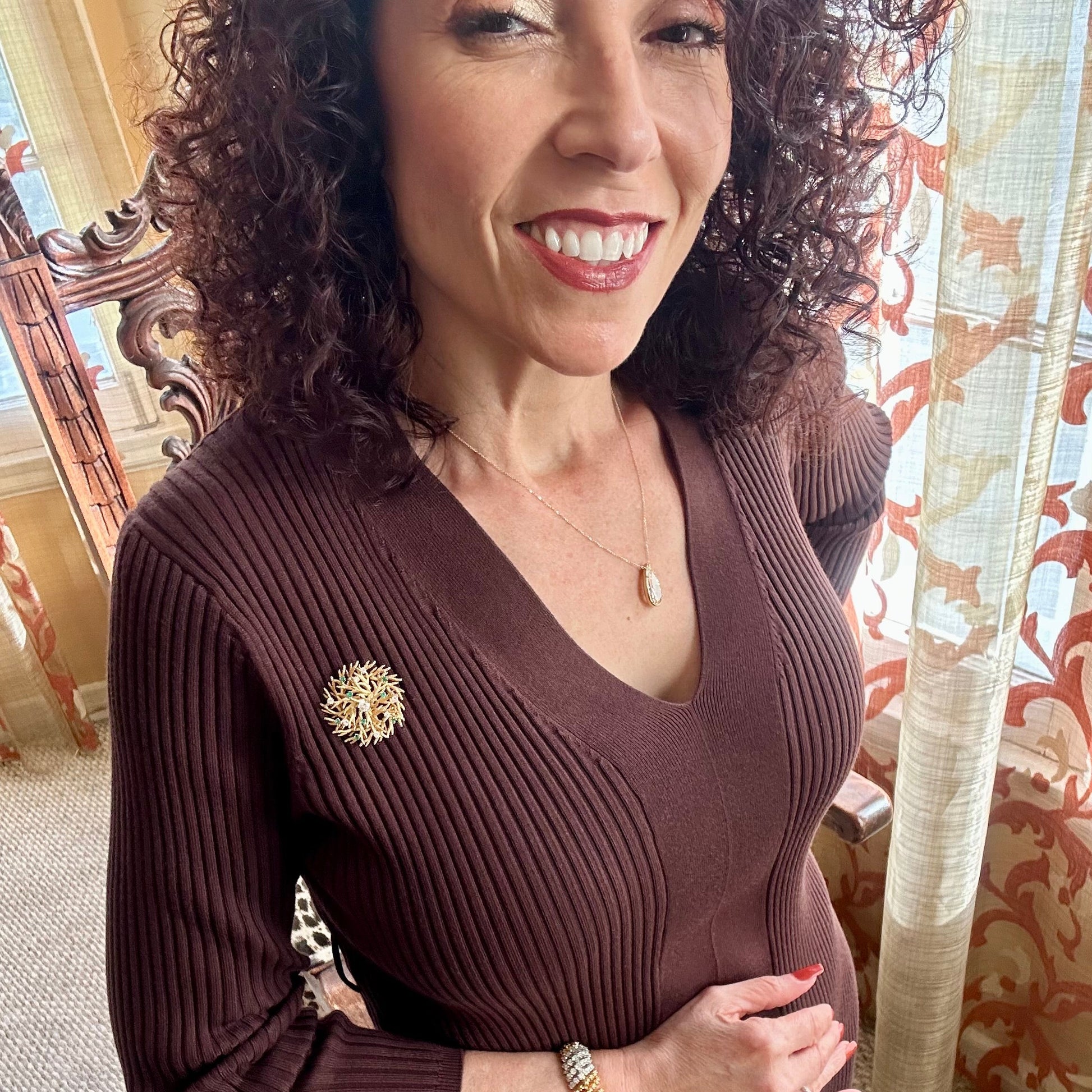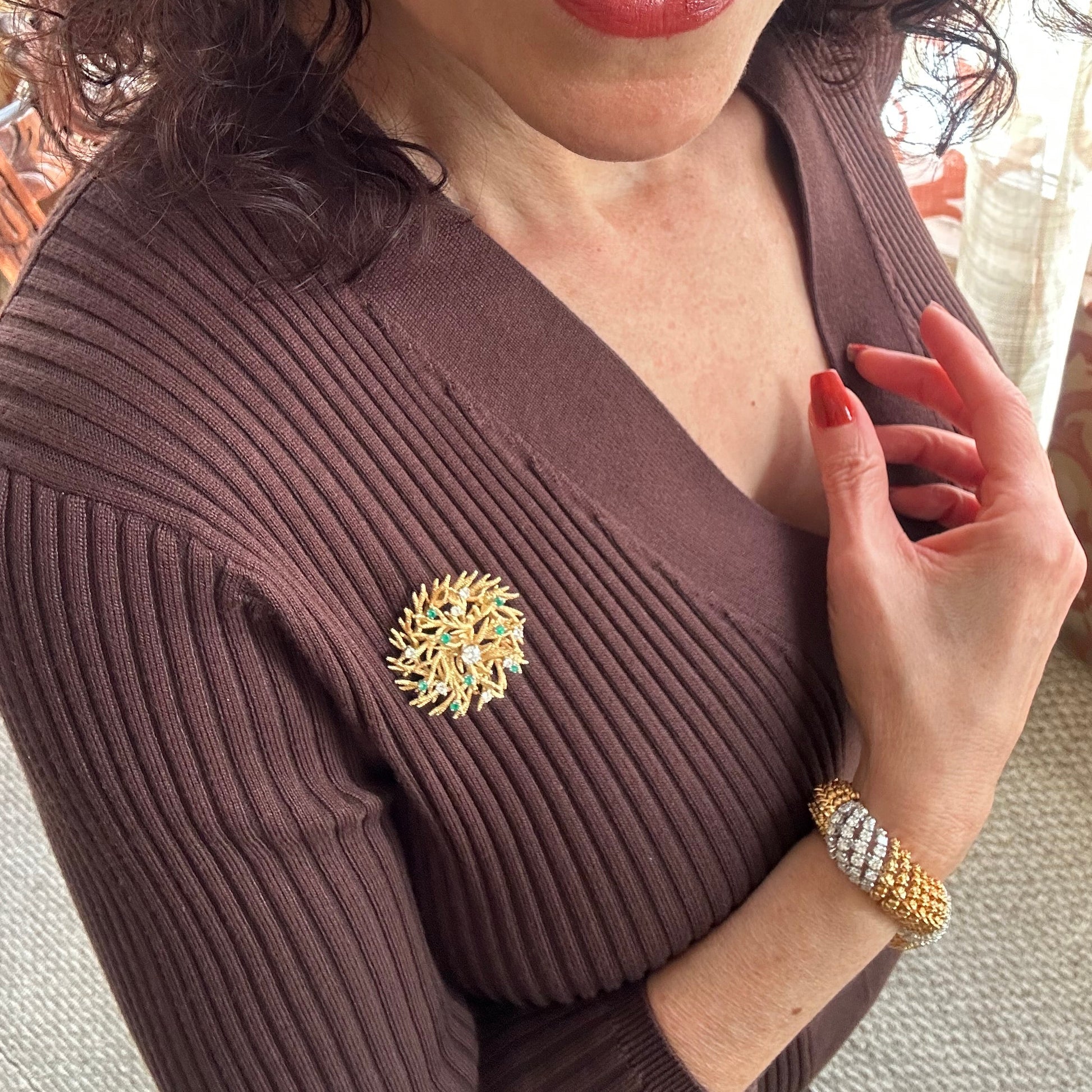 This exquisite brooch channels timeless elegance through its meticulously crafted coral wreath design, adorned with sparkling diamonds and lush green emeralds that dance across the composition. Hand-finished in 18k yellow gold, each delicate wreath detail showcases the artistry of fine jewelry craftsmanship. A versatile statement piece that transitions seamlessly from day to evening wear, this brooch captures the sophistication of classic design while maintaining contemporary appeal. Its enduring aesthetic ensures it remains a treasured accessory for years to come. A rare find for collectors and connoisseurs of fine jewelry.