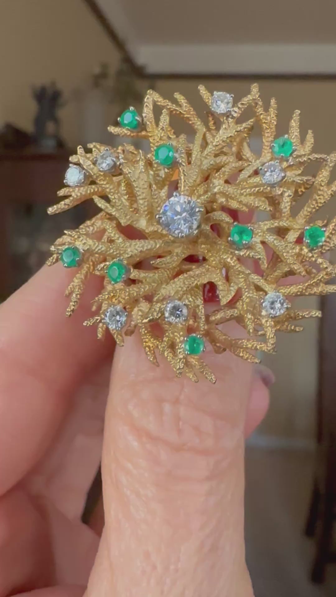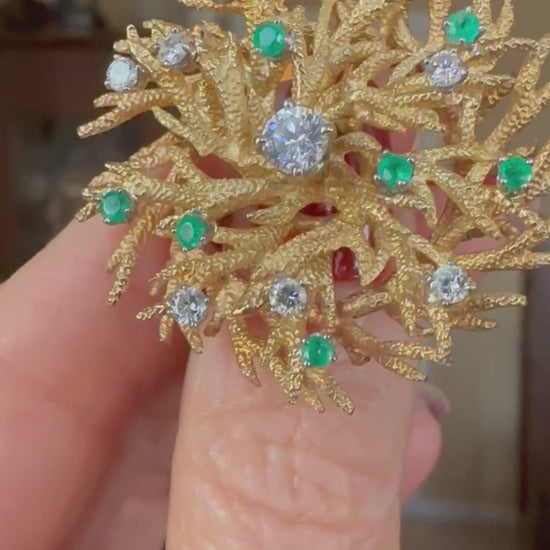 Diamond & Emerald Coral Wreath Brooch/Pin Crafted 18k Yellow Gold
