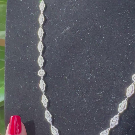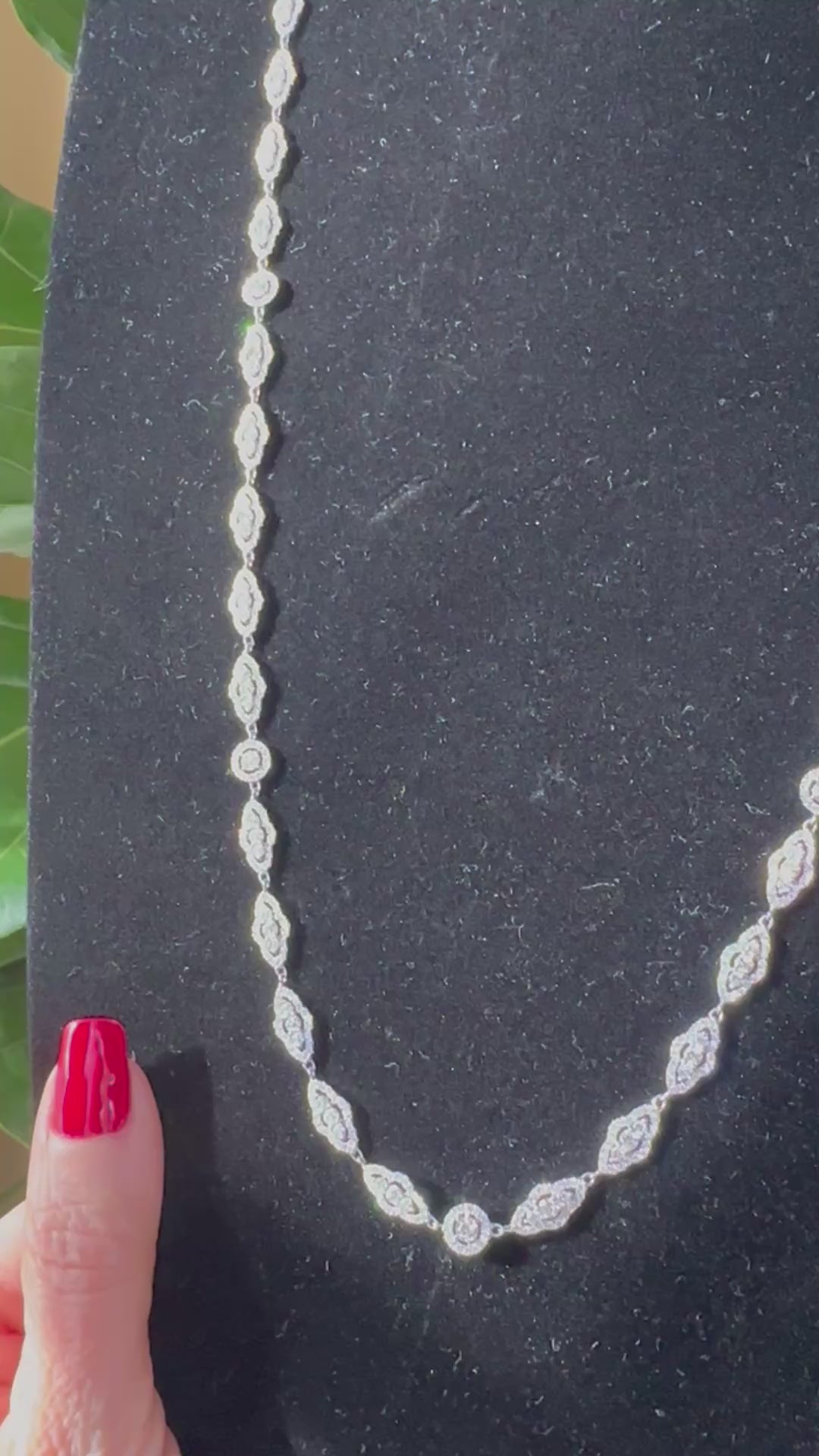 Natural white diamonds in 18k white gold create an understated yet sophisticated look in this reimagined diamonds-by-the-yard necklace. The innovative setting uses round brilliant cut diamonds arranged to evoke the appearance of marquise and round diamond stations, finished with a subtle halo effect that amplifies their sparkle. At 32 inches, this versatile length transitions effortlessly from a single elegant strand to a doubled wrap, giving you multiple styling options for any occasion. Each diamond is carefully positioned to maximize light and brilliance, making this a timeless investment piece perfect for holiday wear and beyond.