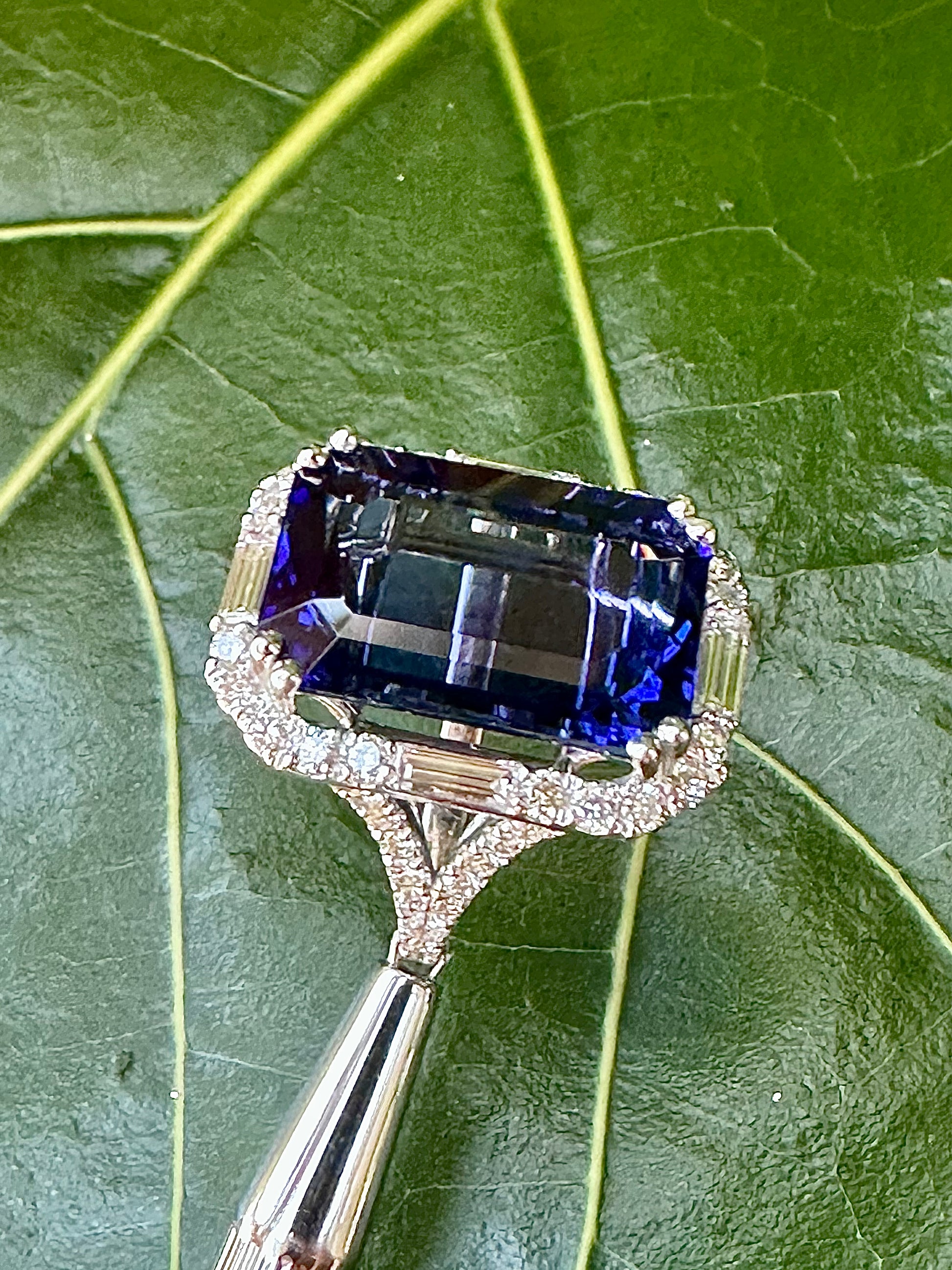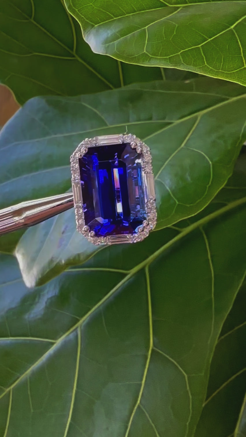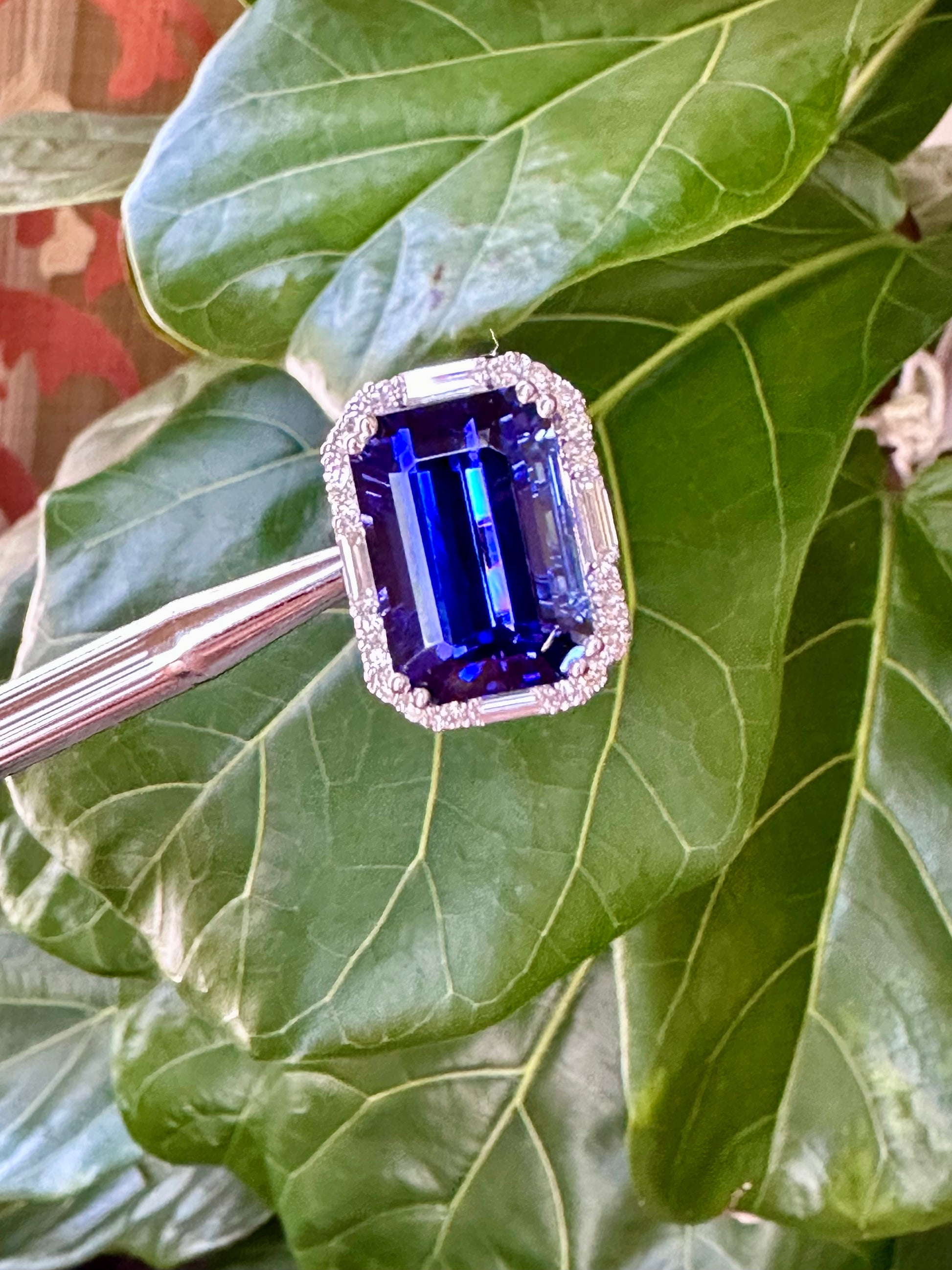 Elevate your jewelry collection with our Tanzanite Emerald Cut & Diamond Ring in 18k white gold. This stunning ring features a deep blueish purple tanzanite stone, expertly cut for maximum brilliance. The eye-clean stone is complemented by brilliant cut diamonds and baguettes, making it a must-have for any special occasion.