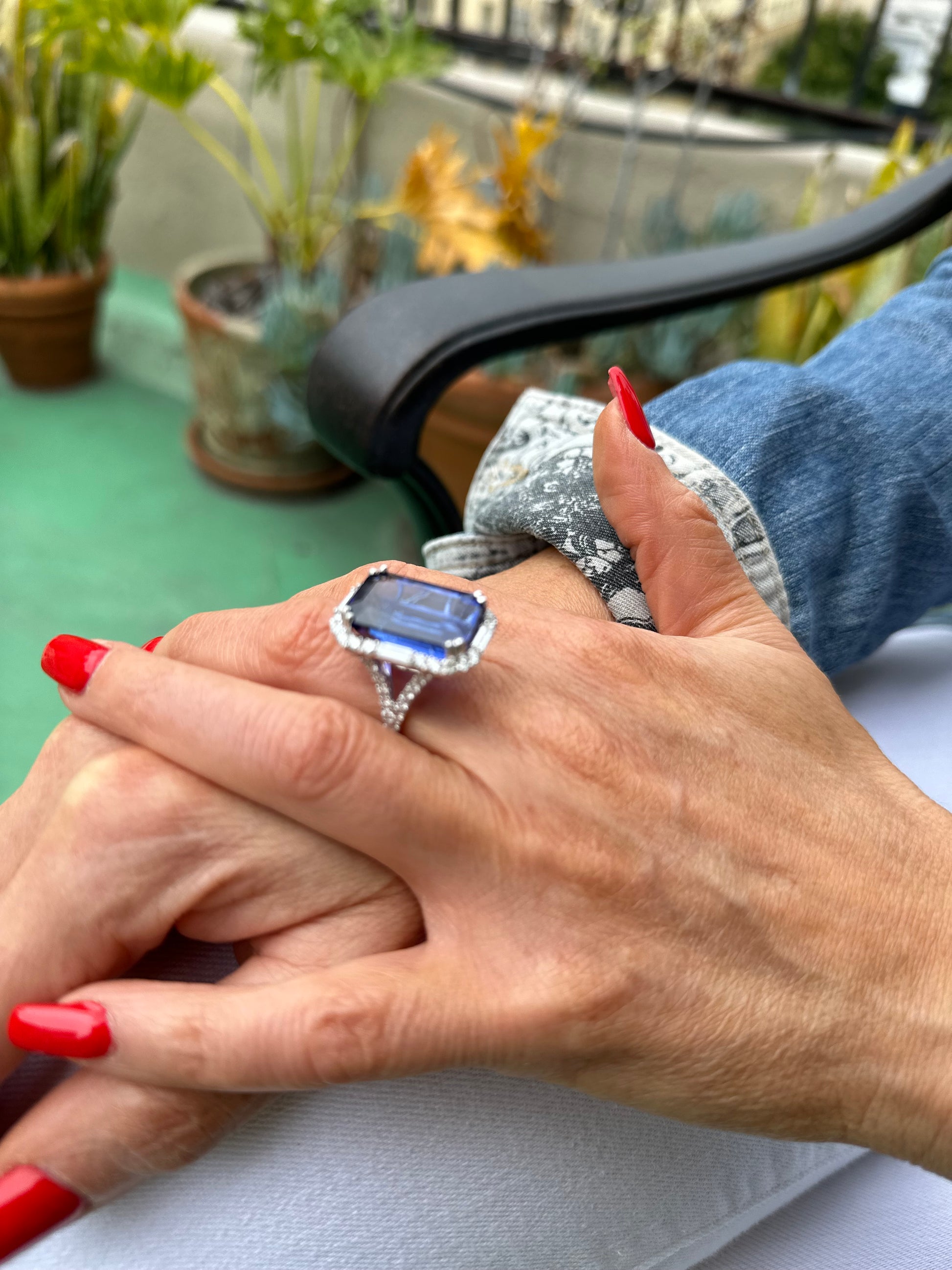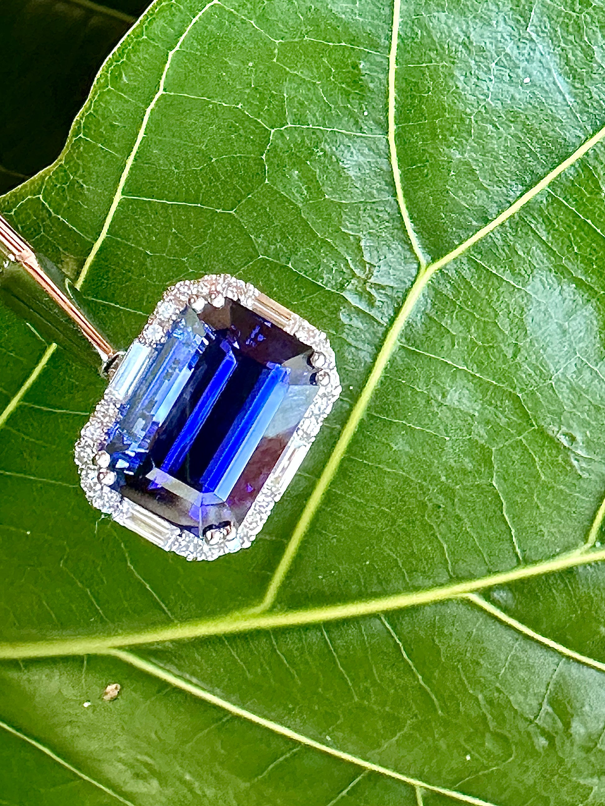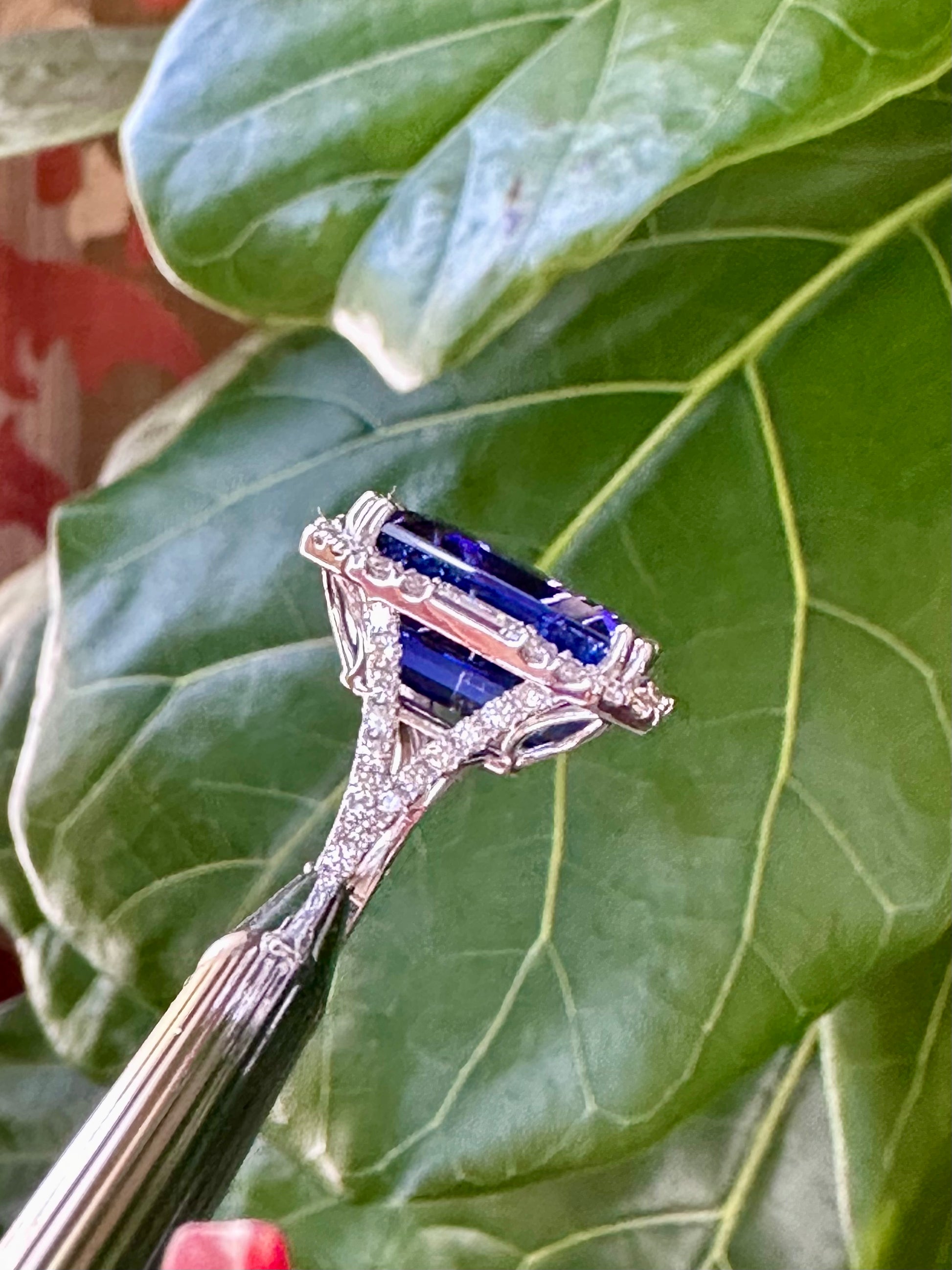 Elevate your jewelry collection with our Tanzanite Emerald Cut & Diamond Ring in 18k white gold. This stunning ring features a deep blueish purple tanzanite stone, expertly cut for maximum brilliance. The eye-clean stone is complemented by brilliant cut diamonds and baguettes, making it a must-have for any special occasion.