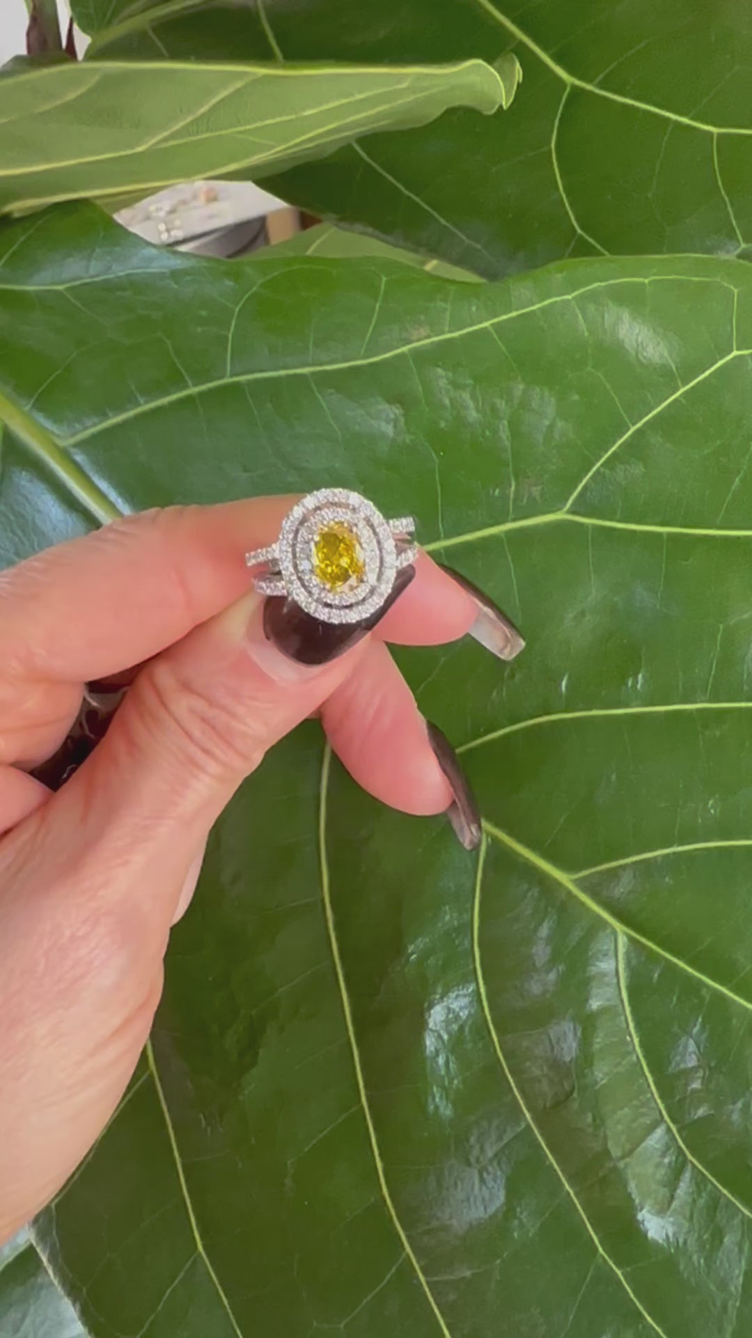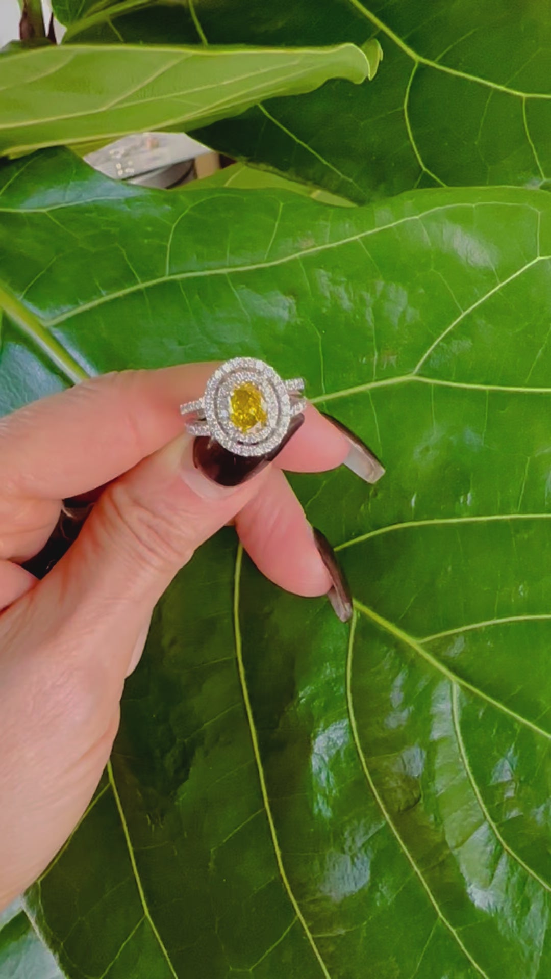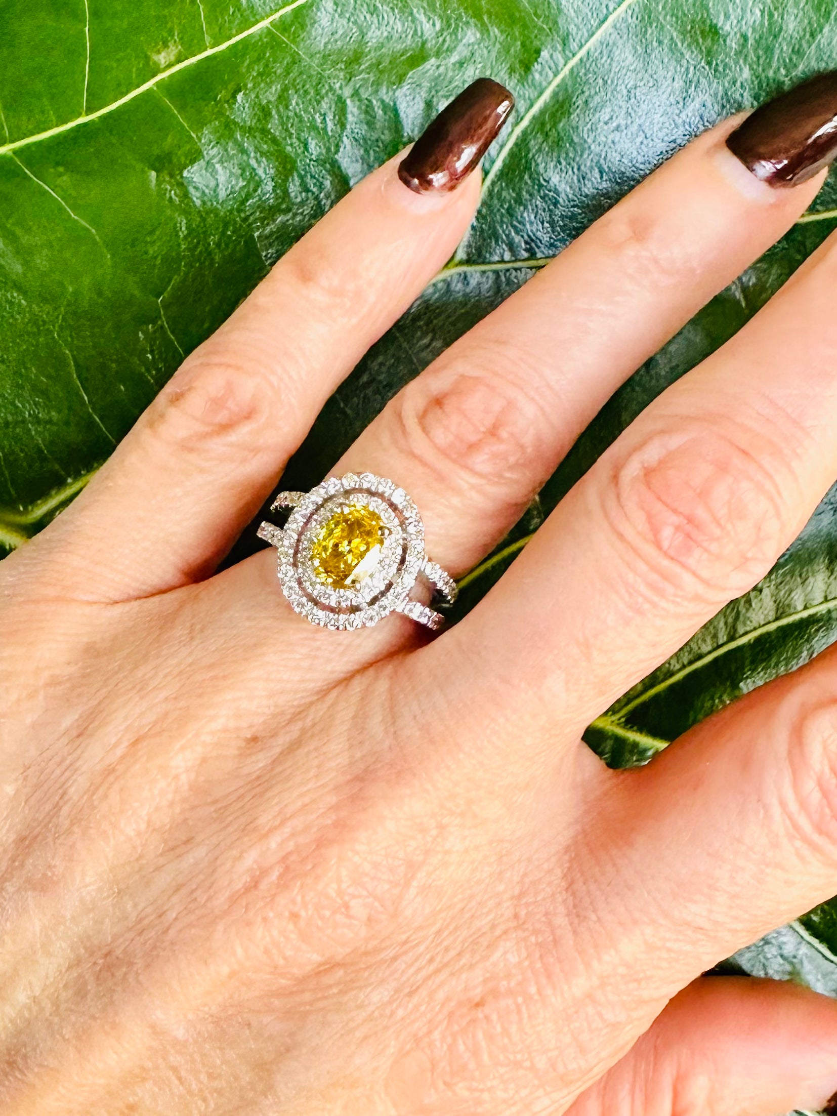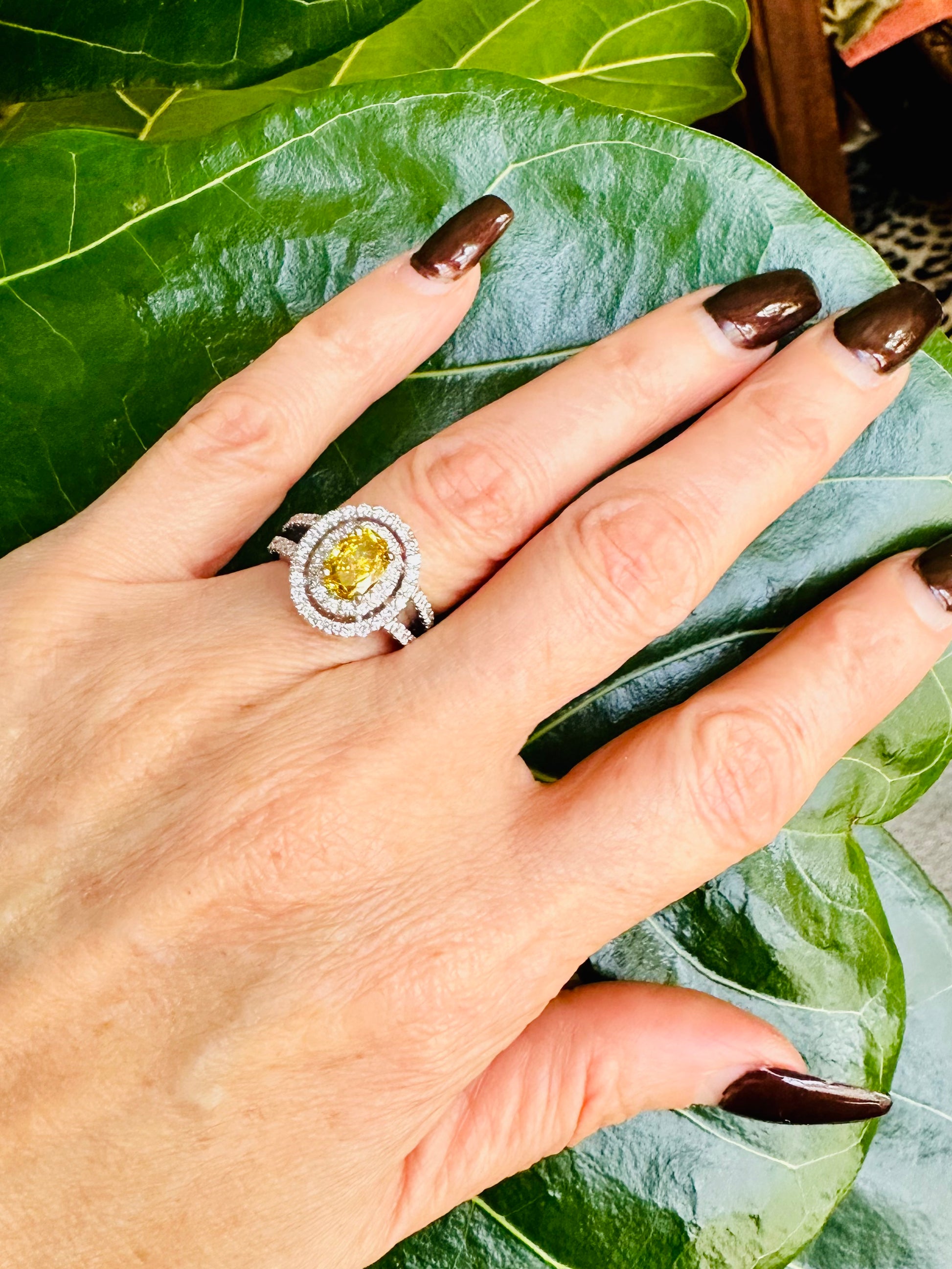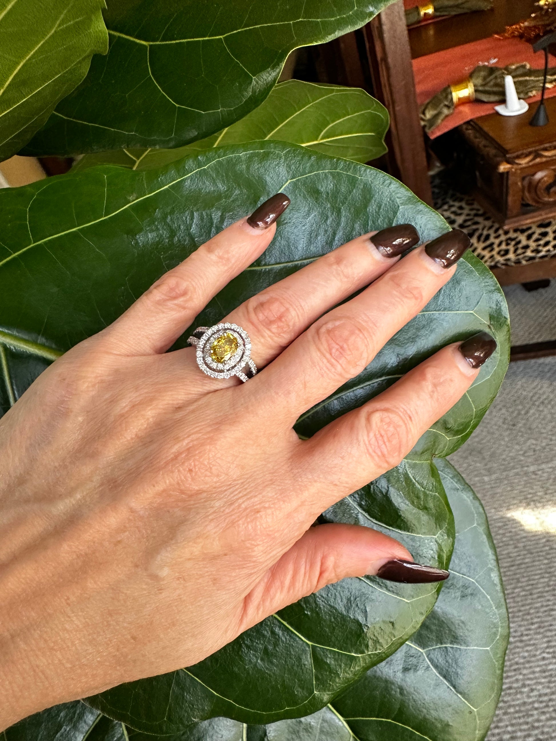 Experience elegance and luxury with our Fancy Dark Yellow Diamond Halo Setting in Platinum. This stunning piece features an Oval Cut Fancy Dark Yellow Diamond surrounded by sparkling white diamonds in a platinum setting. Perfect for any special occasion or anniversary celebration. Own a truly unique and timeless piece of jewelry.