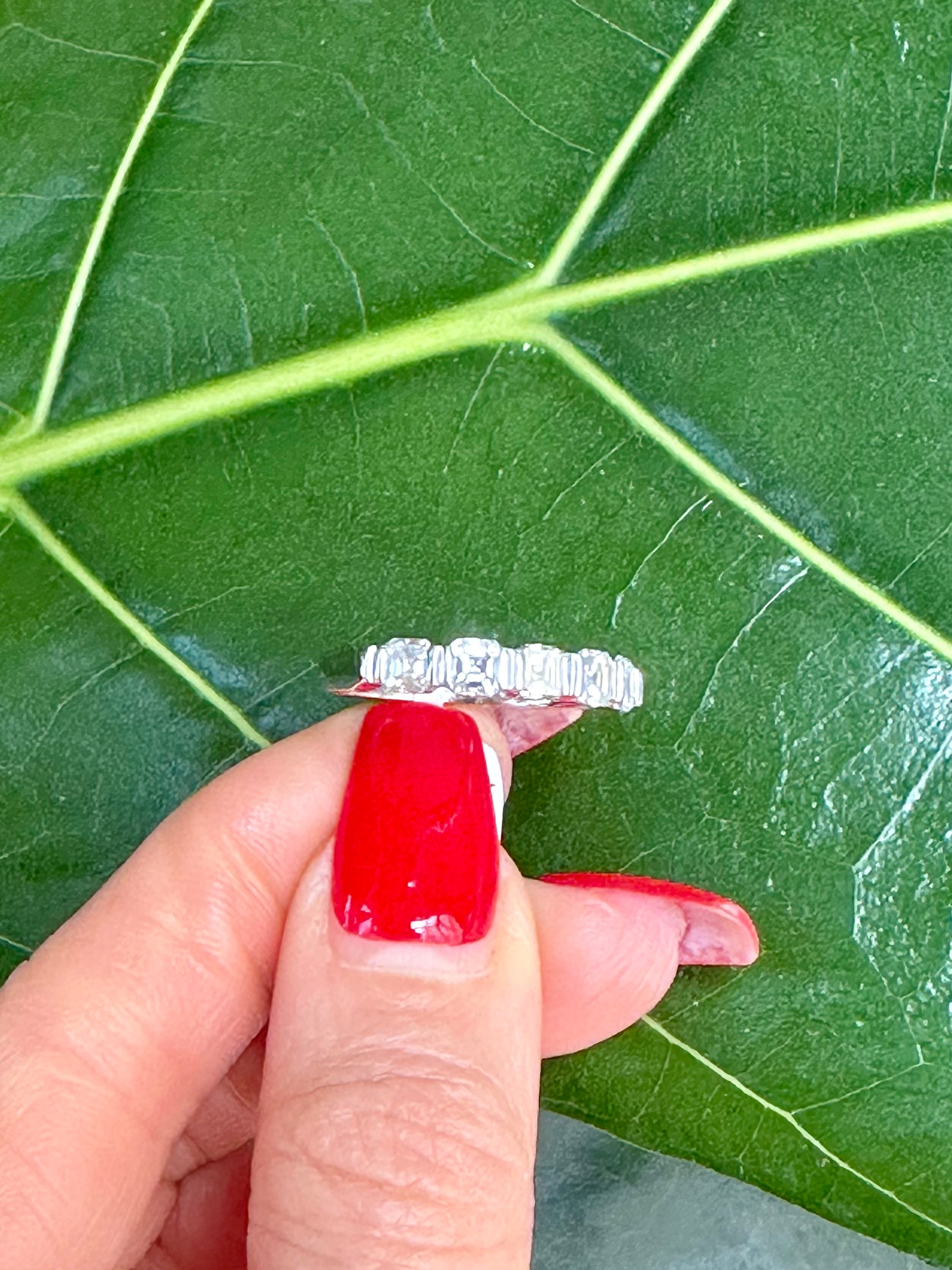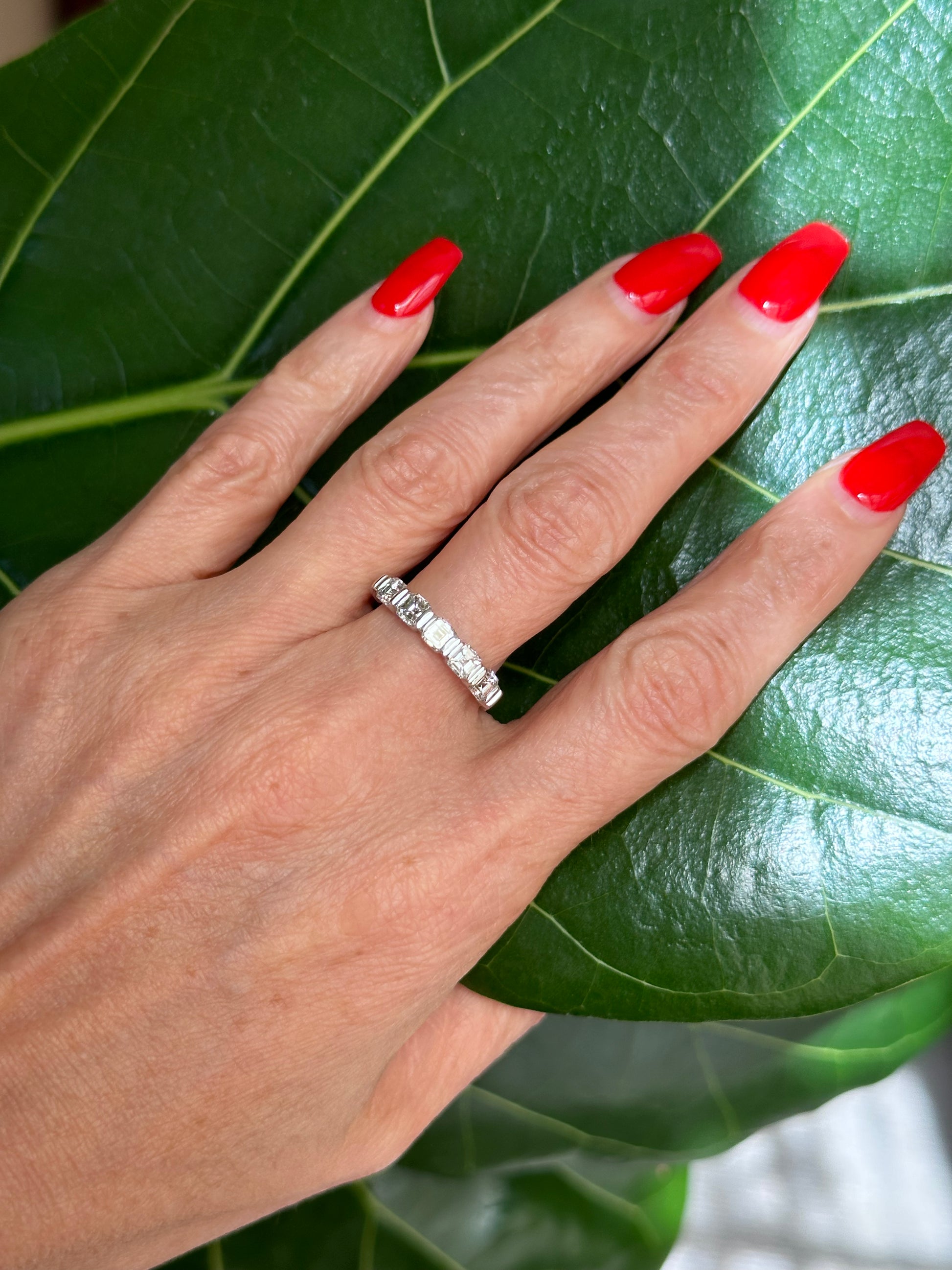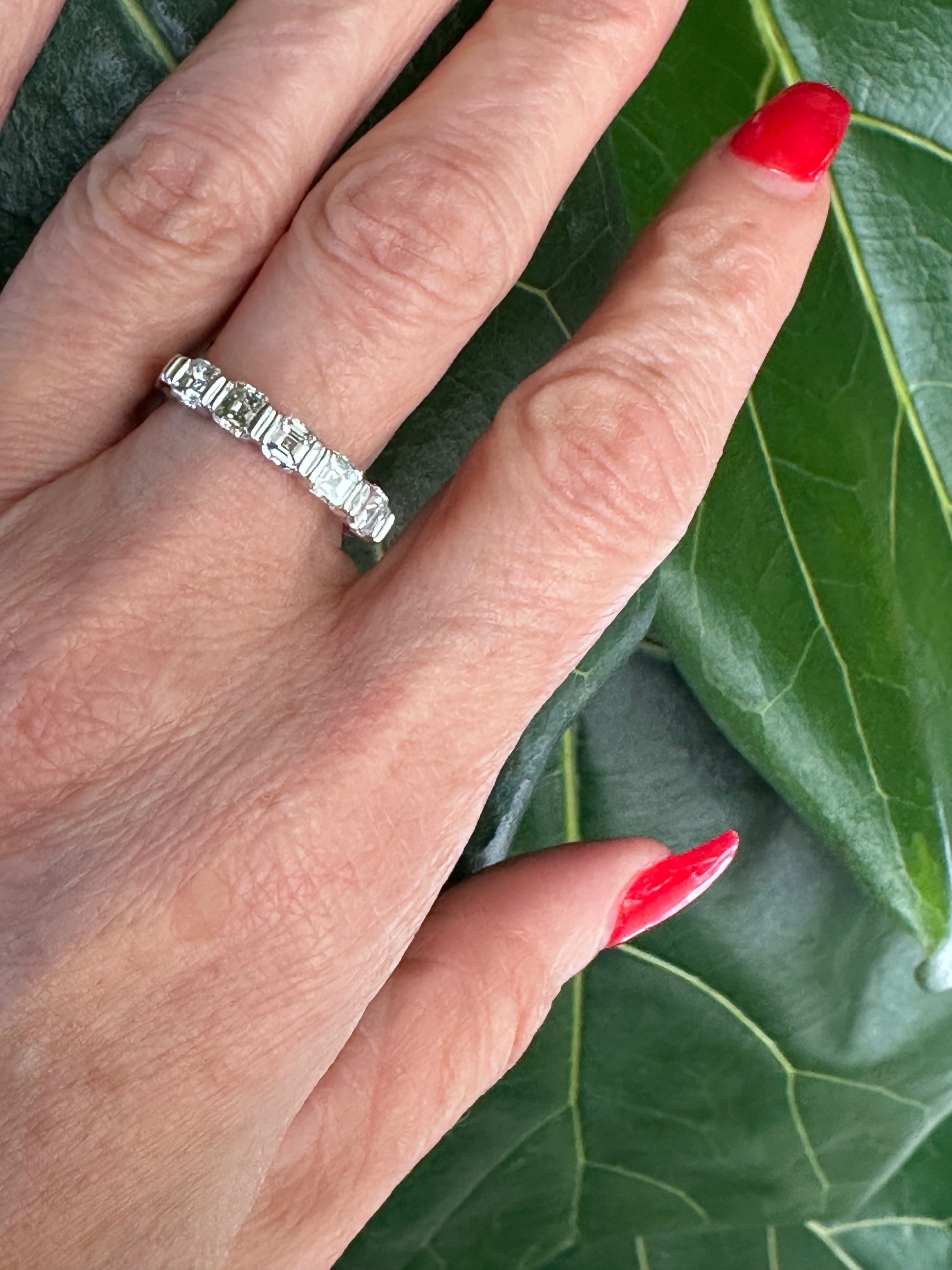 Expertly crafted with five carefully selected, natural asscher cut diamonds, this platinum band is the perfect complement to your engagement ring. Its smooth touch and timeless, elegant design make it a great addition for those who love to stack rings. Upgrade your accessory game with this classic and sophisticated piece.