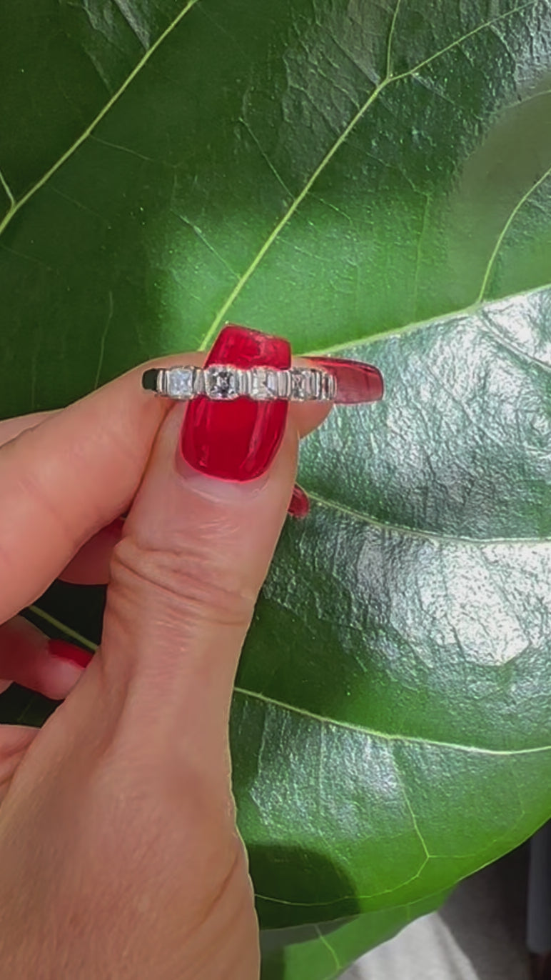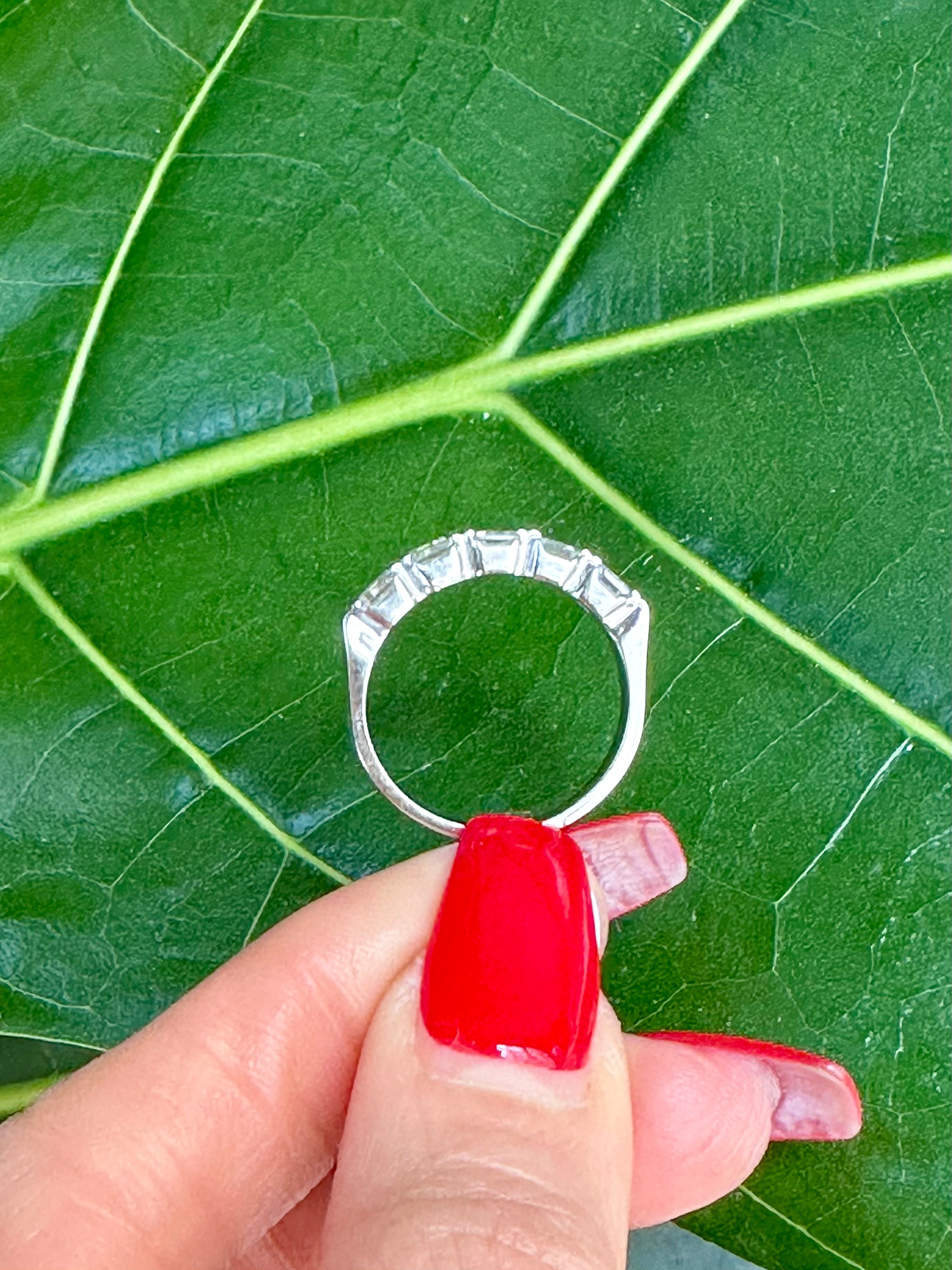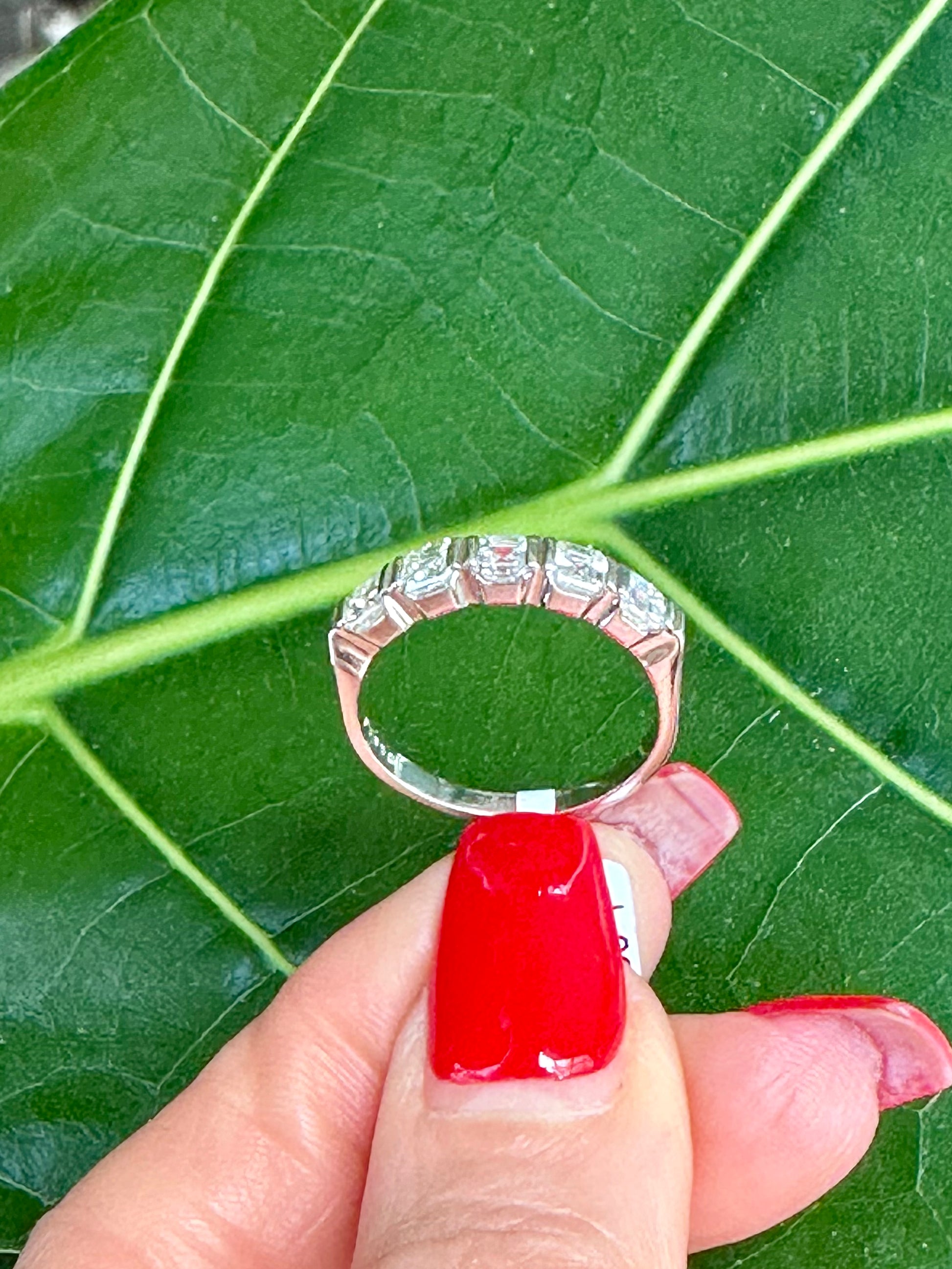Expertly crafted with five carefully selected, natural asscher cut diamonds, this platinum band is the perfect complement to your engagement ring. Its smooth touch and timeless, elegant design make it a great addition for those who love to stack rings. Upgrade your accessory game with this classic and sophisticated piece.
