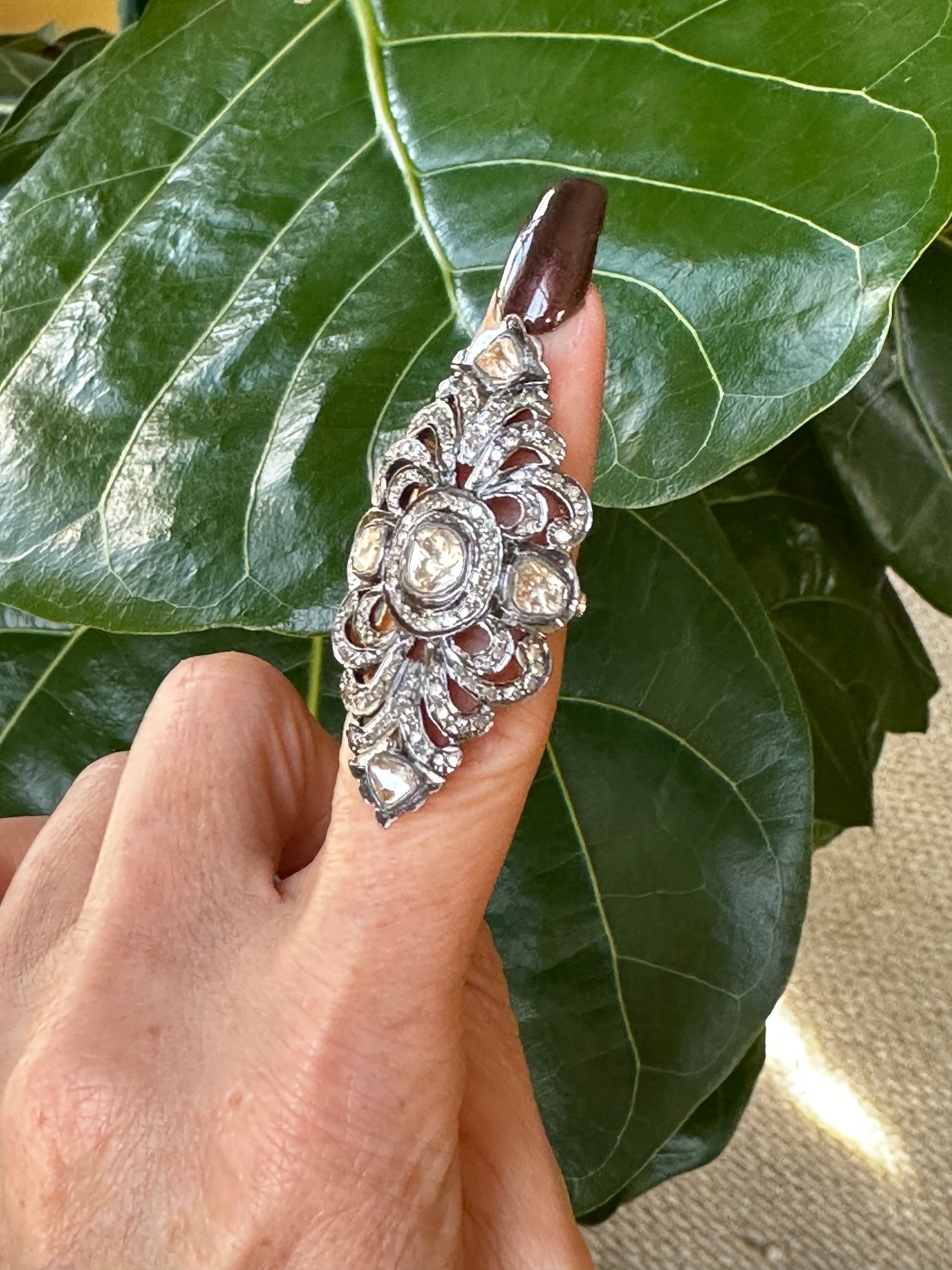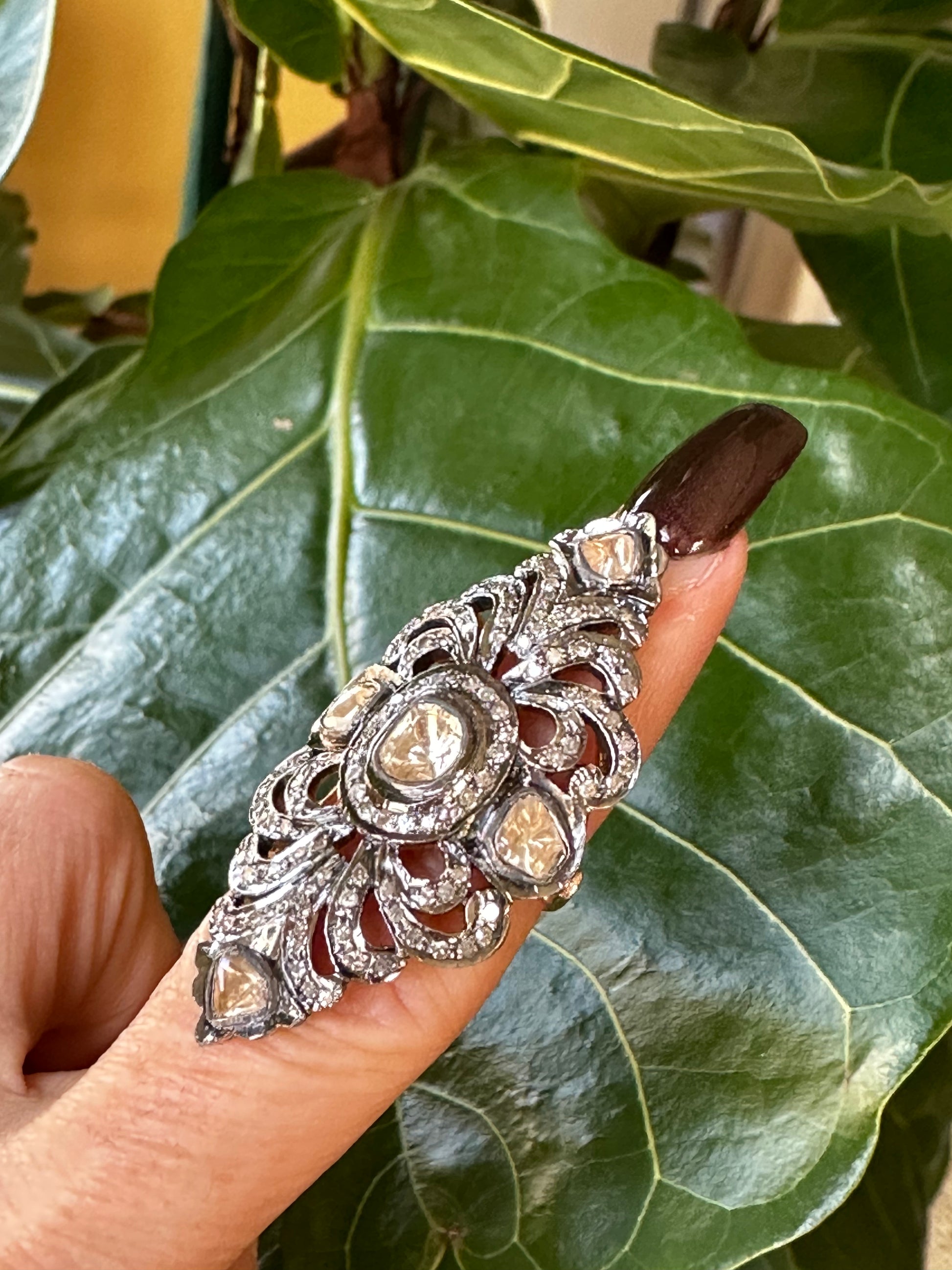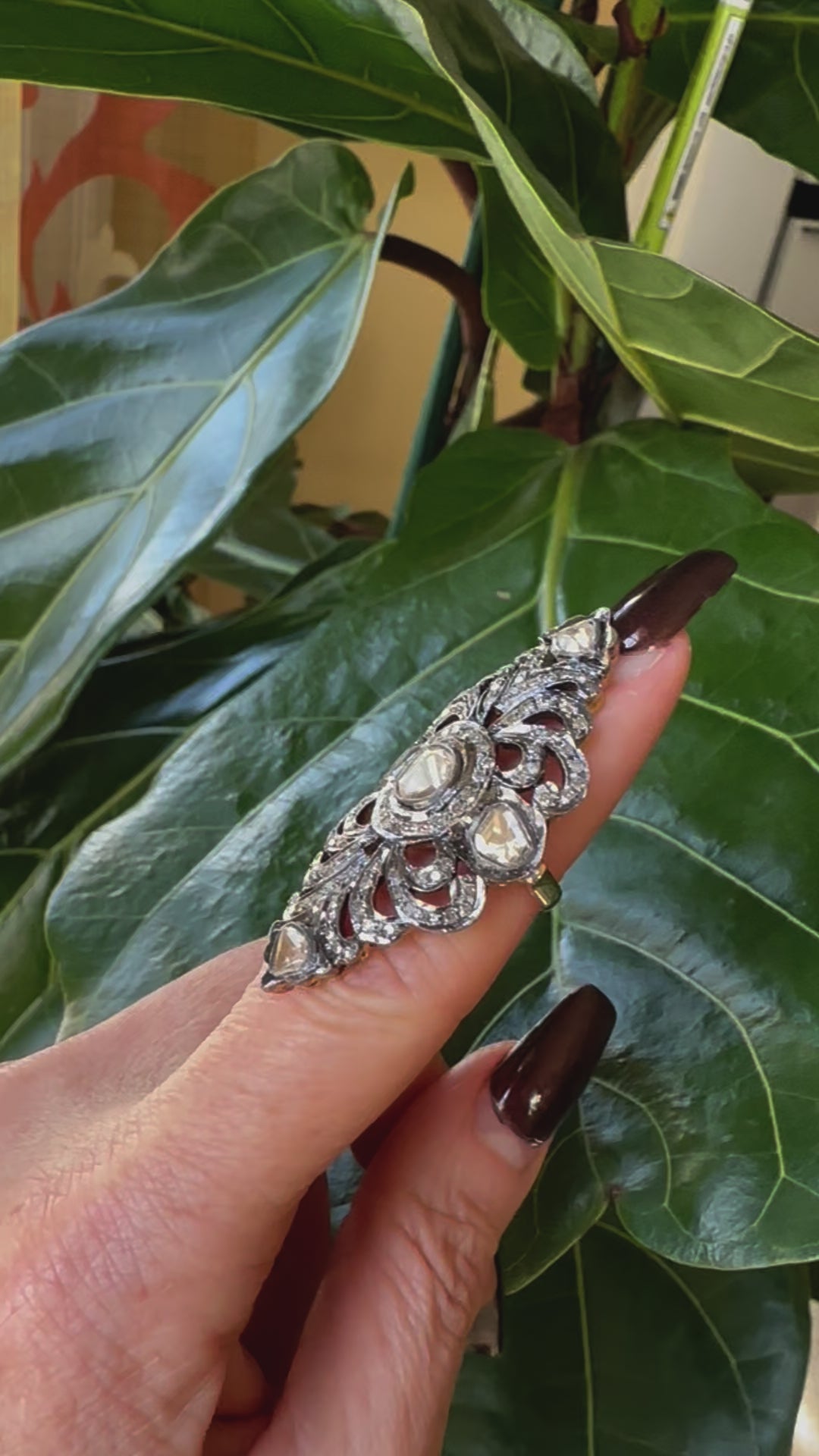 This handmade Art Deco Kali design ring is a one-of-a-kind piece crafted from sterling silver 925 and 18K yellow gold. Featuring rosecut and uncut diamonds in a polki setting, it is inspired by the Victorian era and boasts an elegant, timeless design.