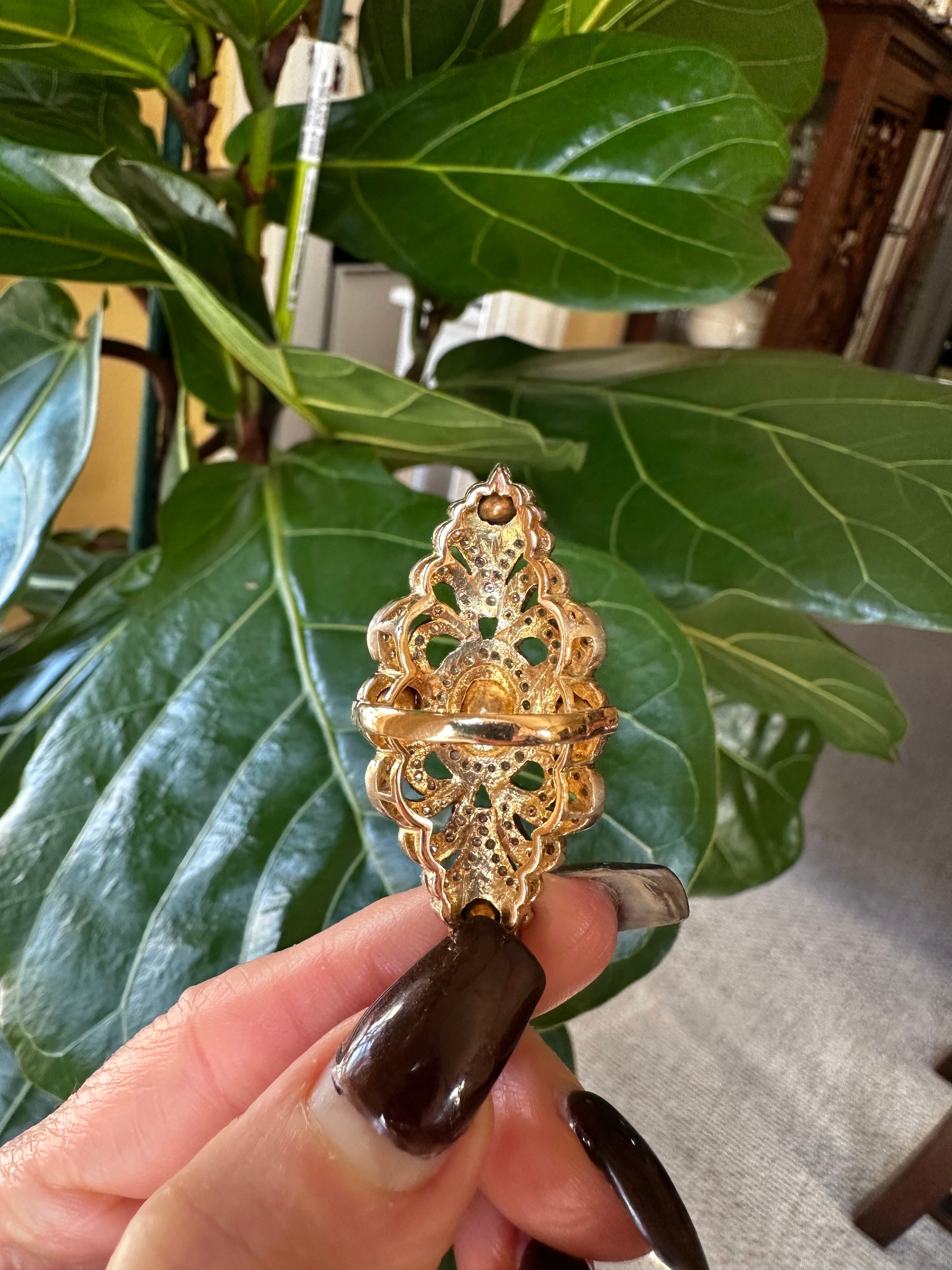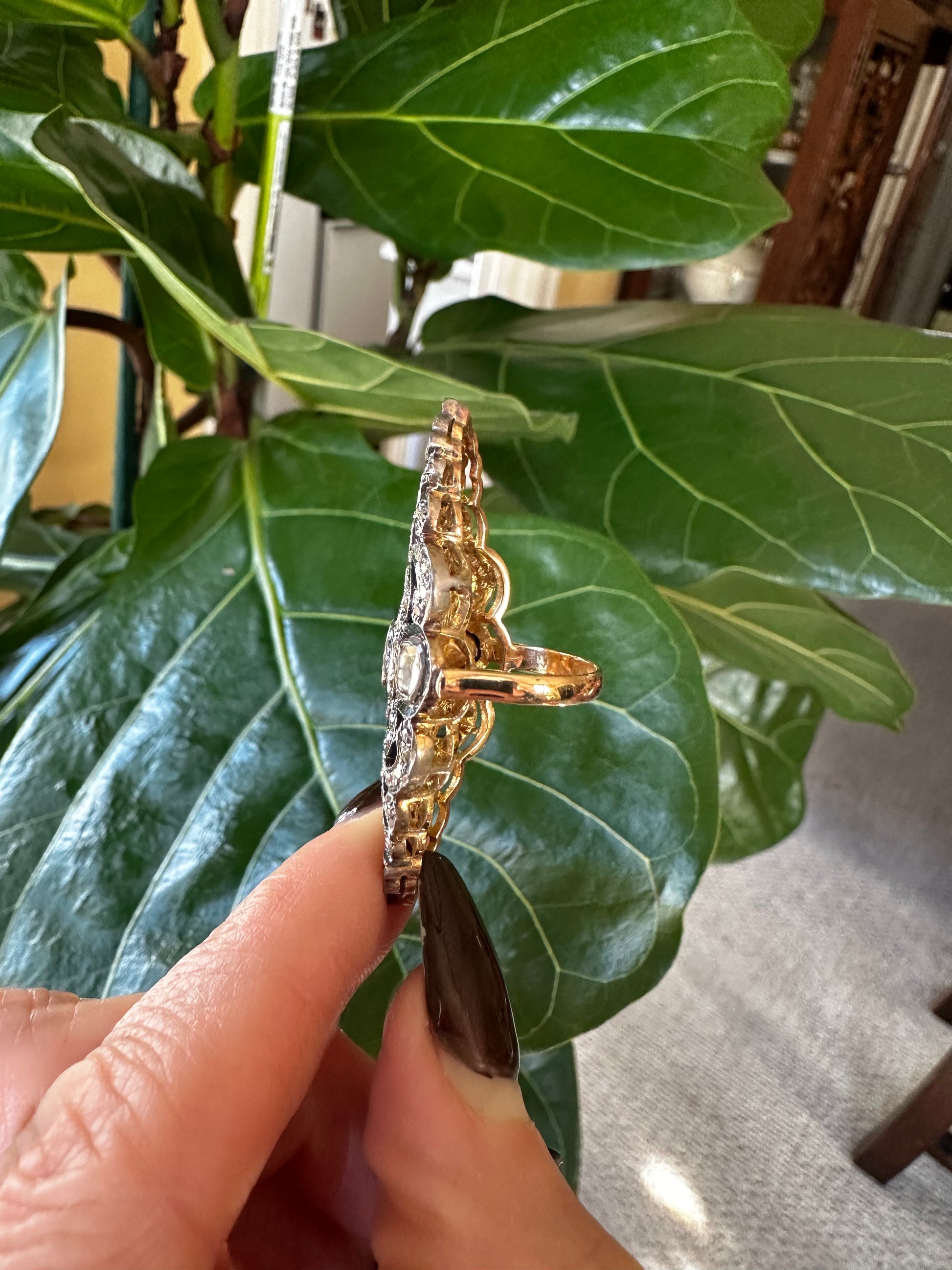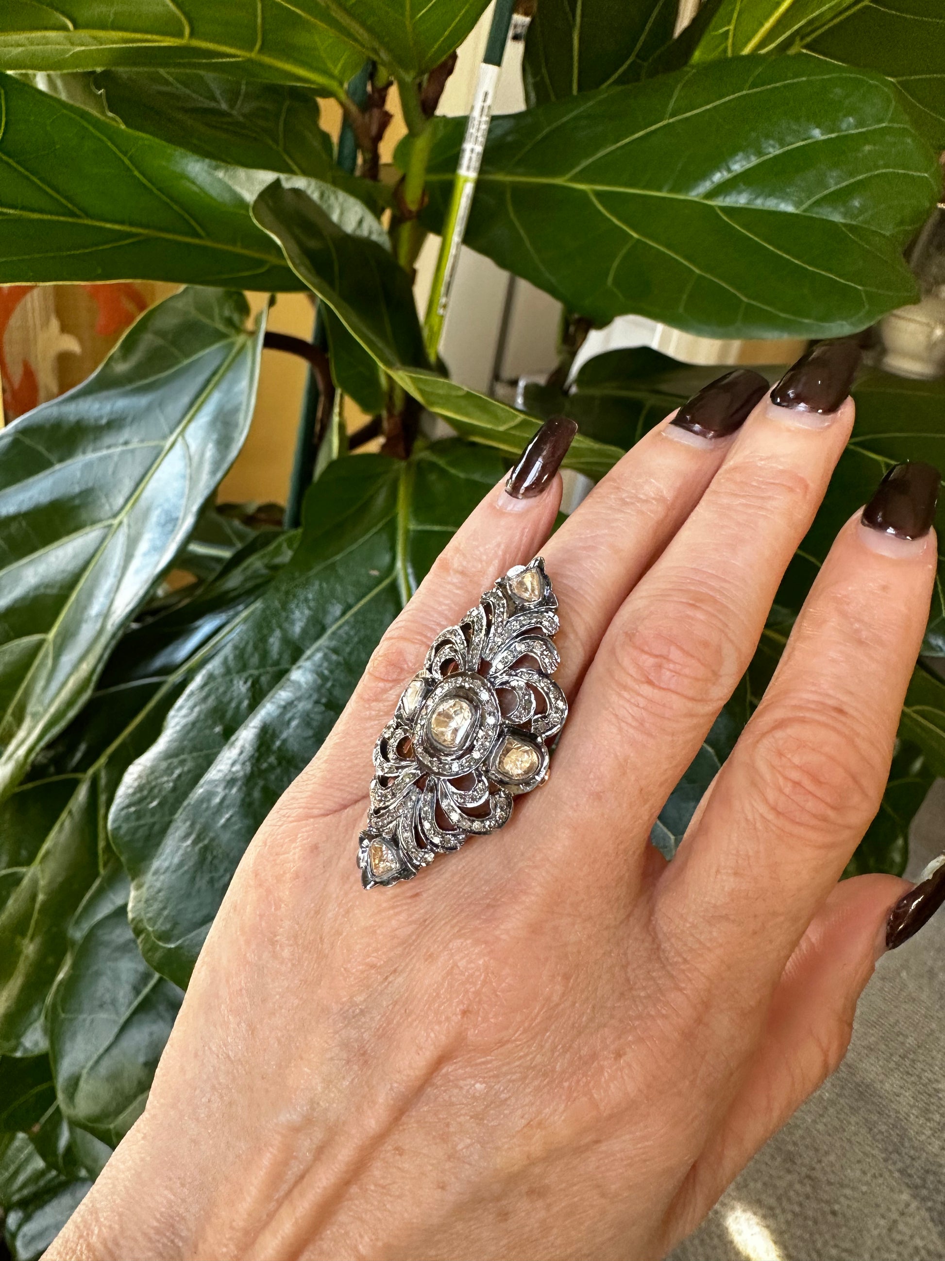 This handmade Art Deco Kali design ring is a one-of-a-kind piece crafted from sterling silver 925 and 18K yellow gold. Featuring rosecut and uncut diamonds in a polki setting, it is inspired by the Victorian era and boasts an elegant, timeless design.