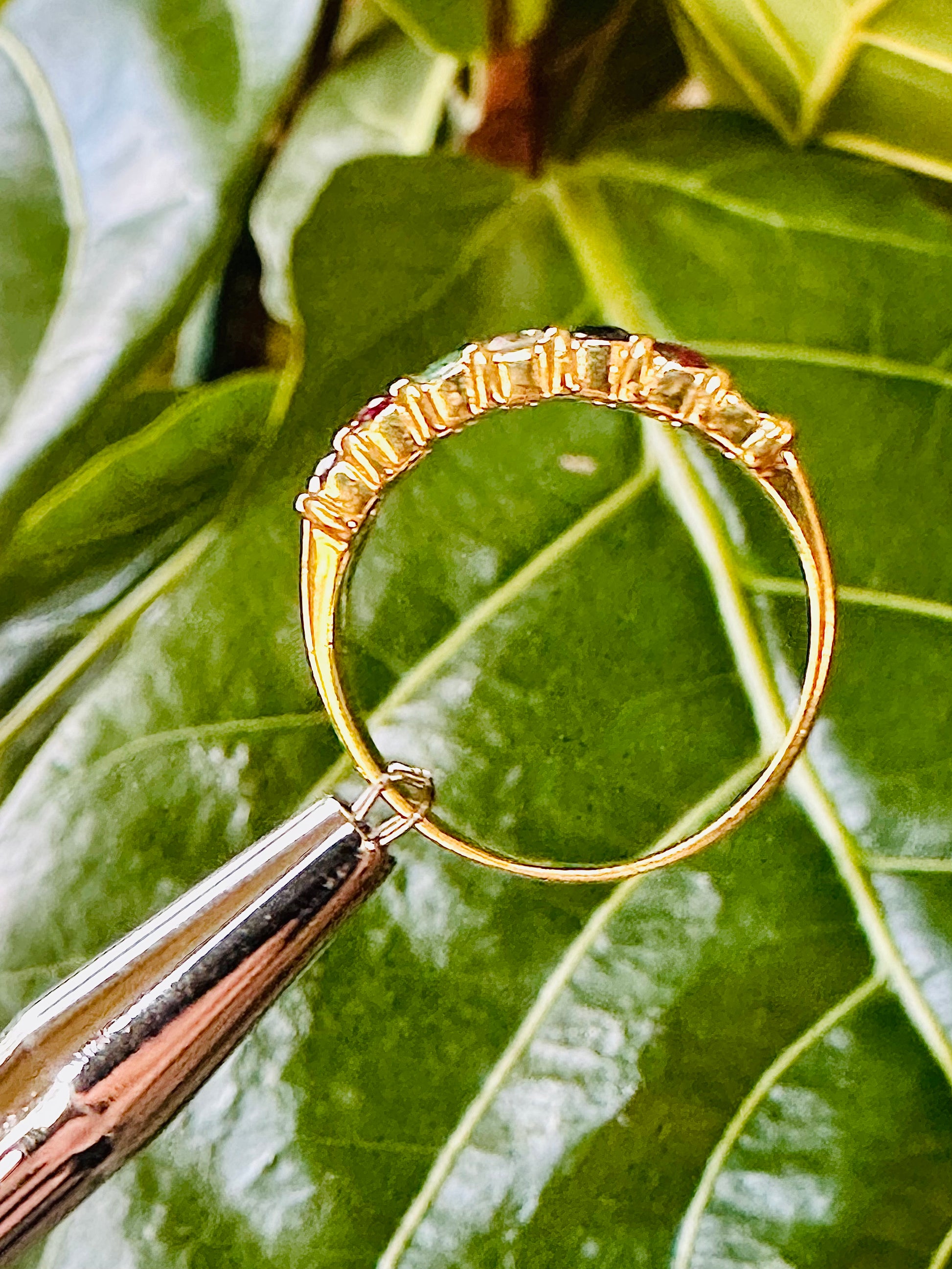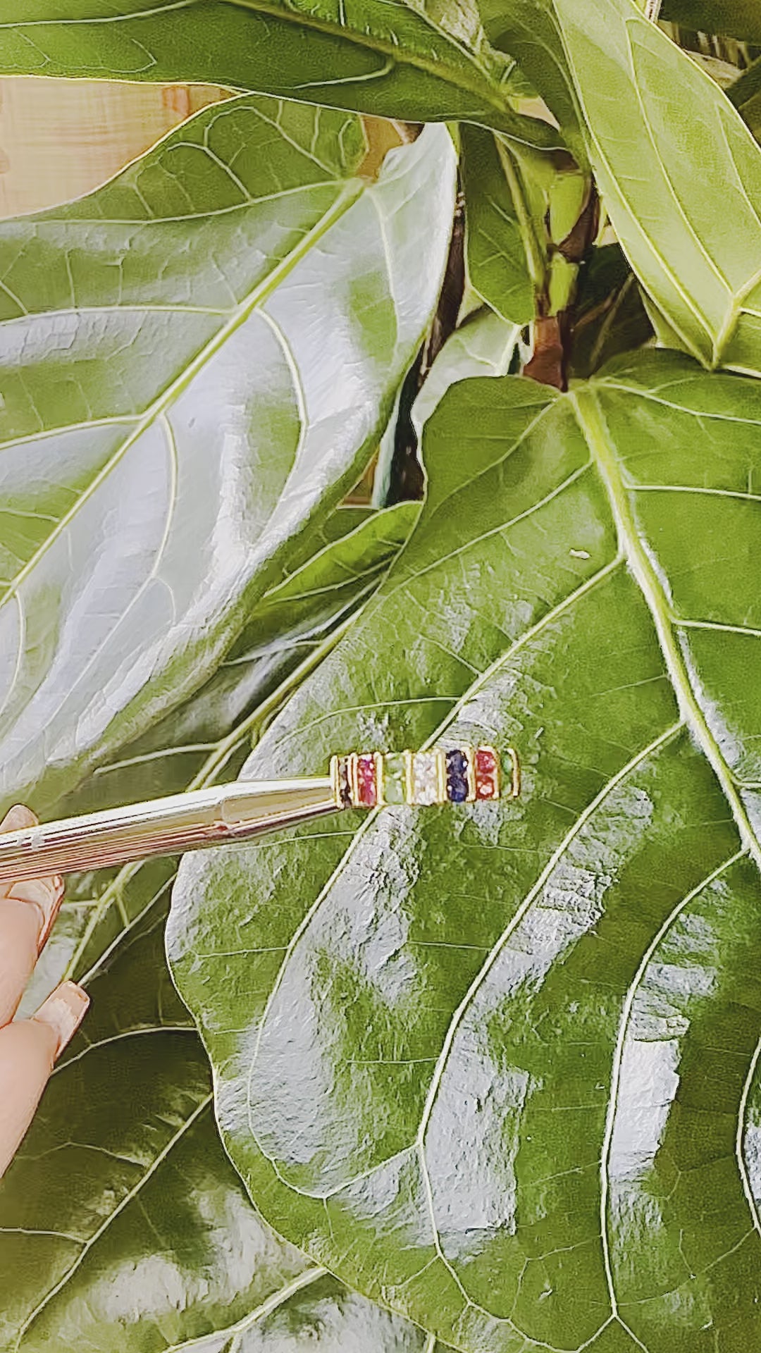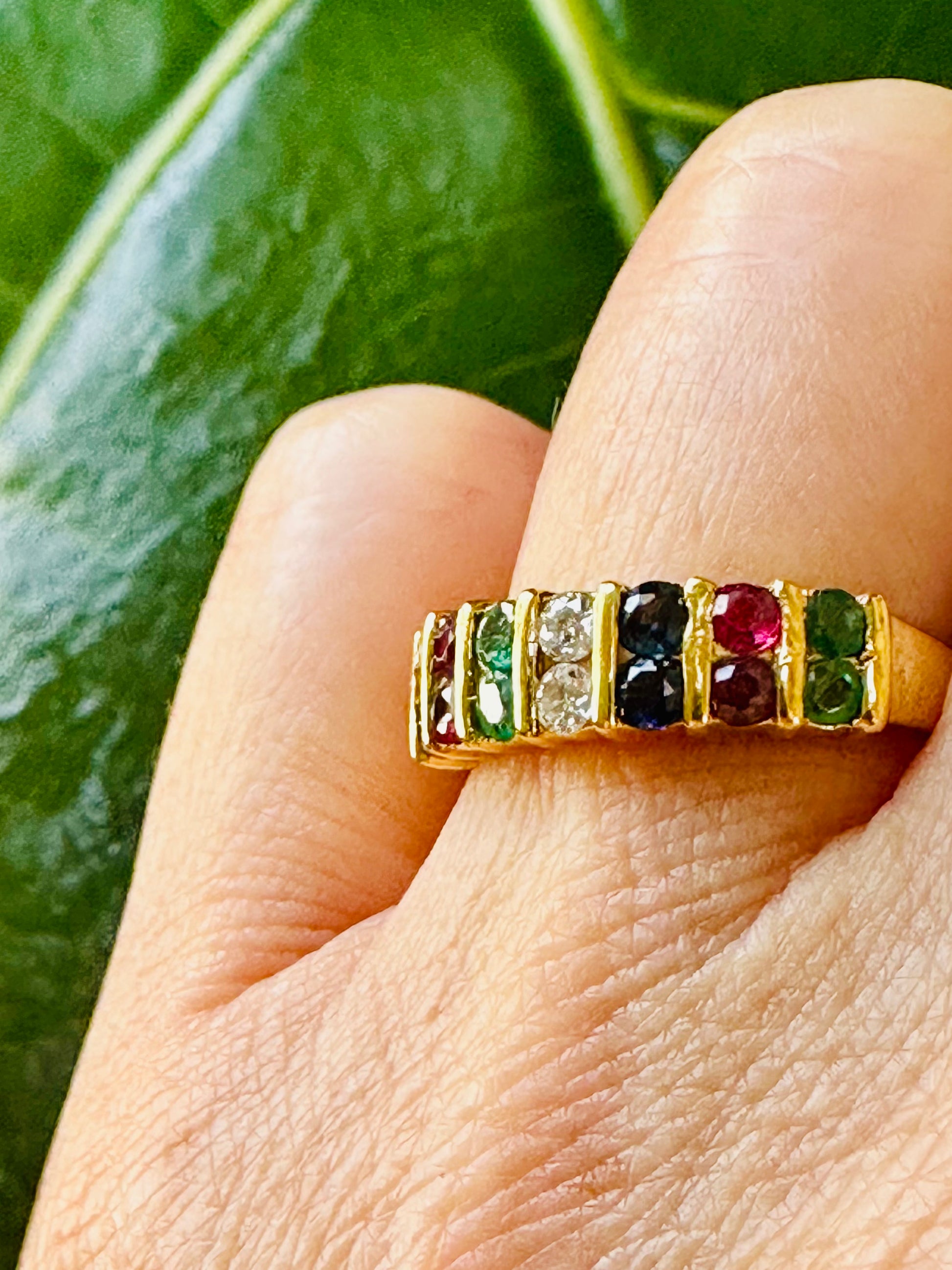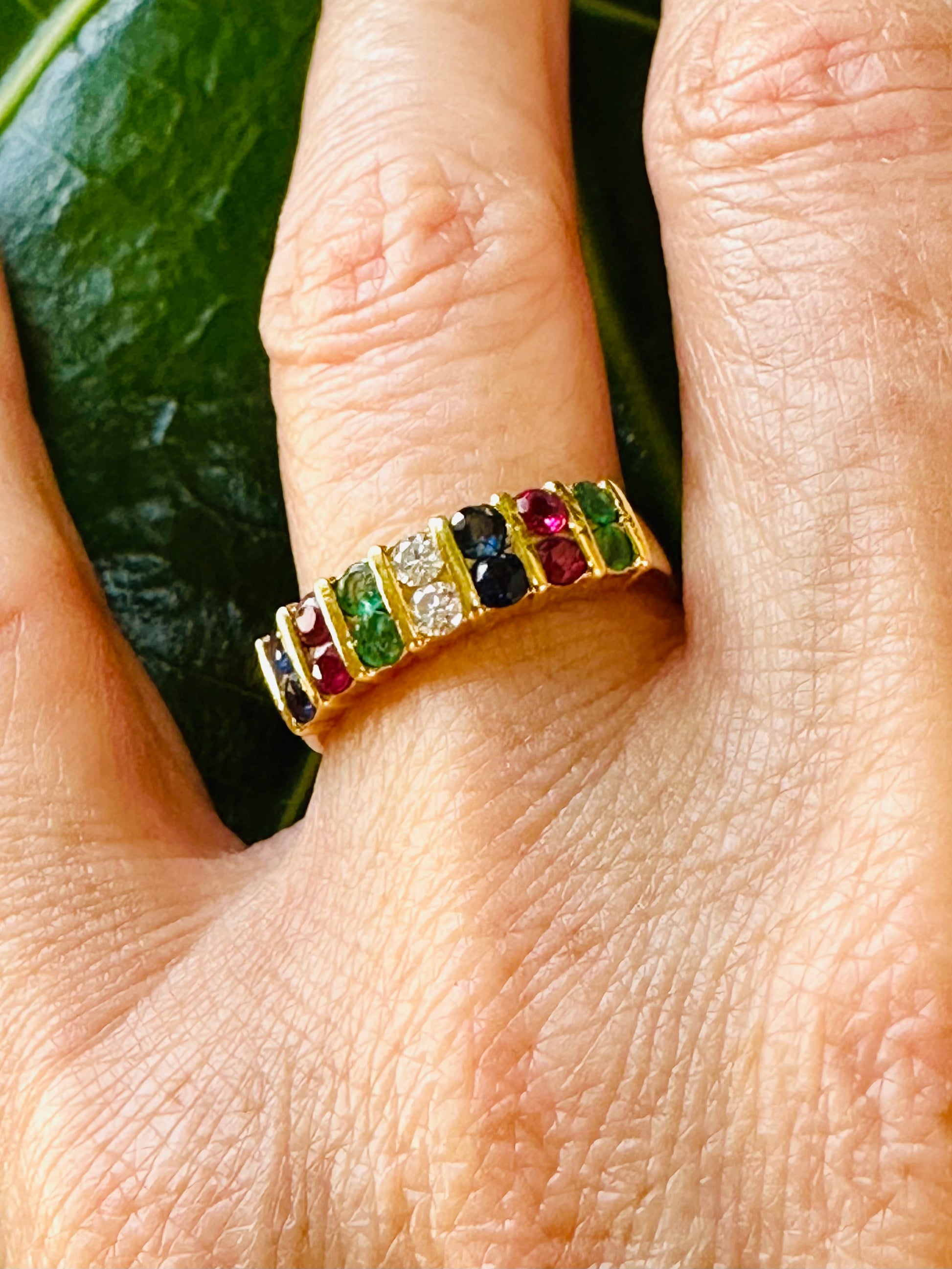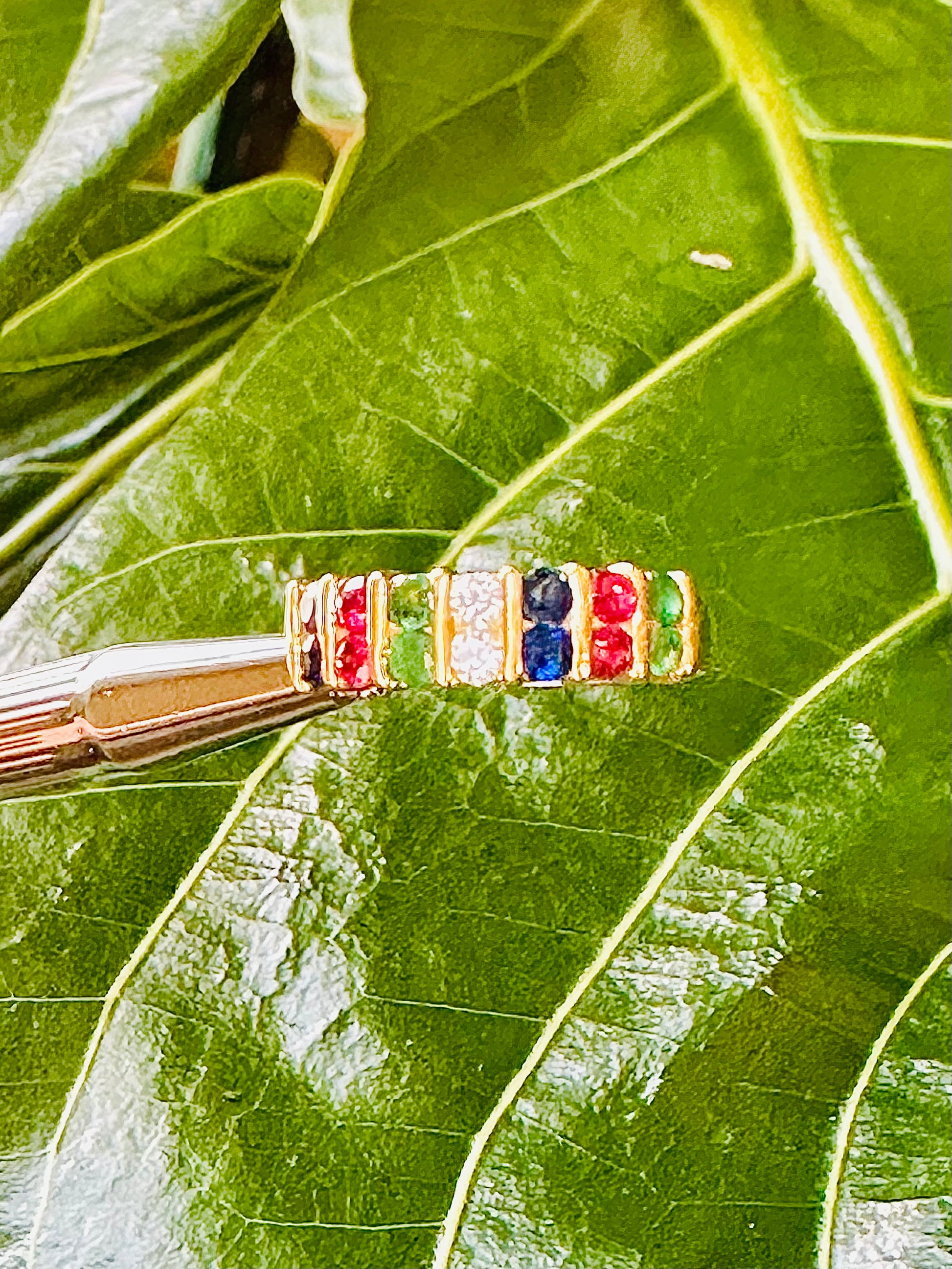 This versatile stackable ring is crafted in 18K yellow gold, featuring a chic combination of rubies, diamonds, emeralds and sapphires in an 80's design classic. With a weight of 3.3 grams, it's perfect for daily wear.