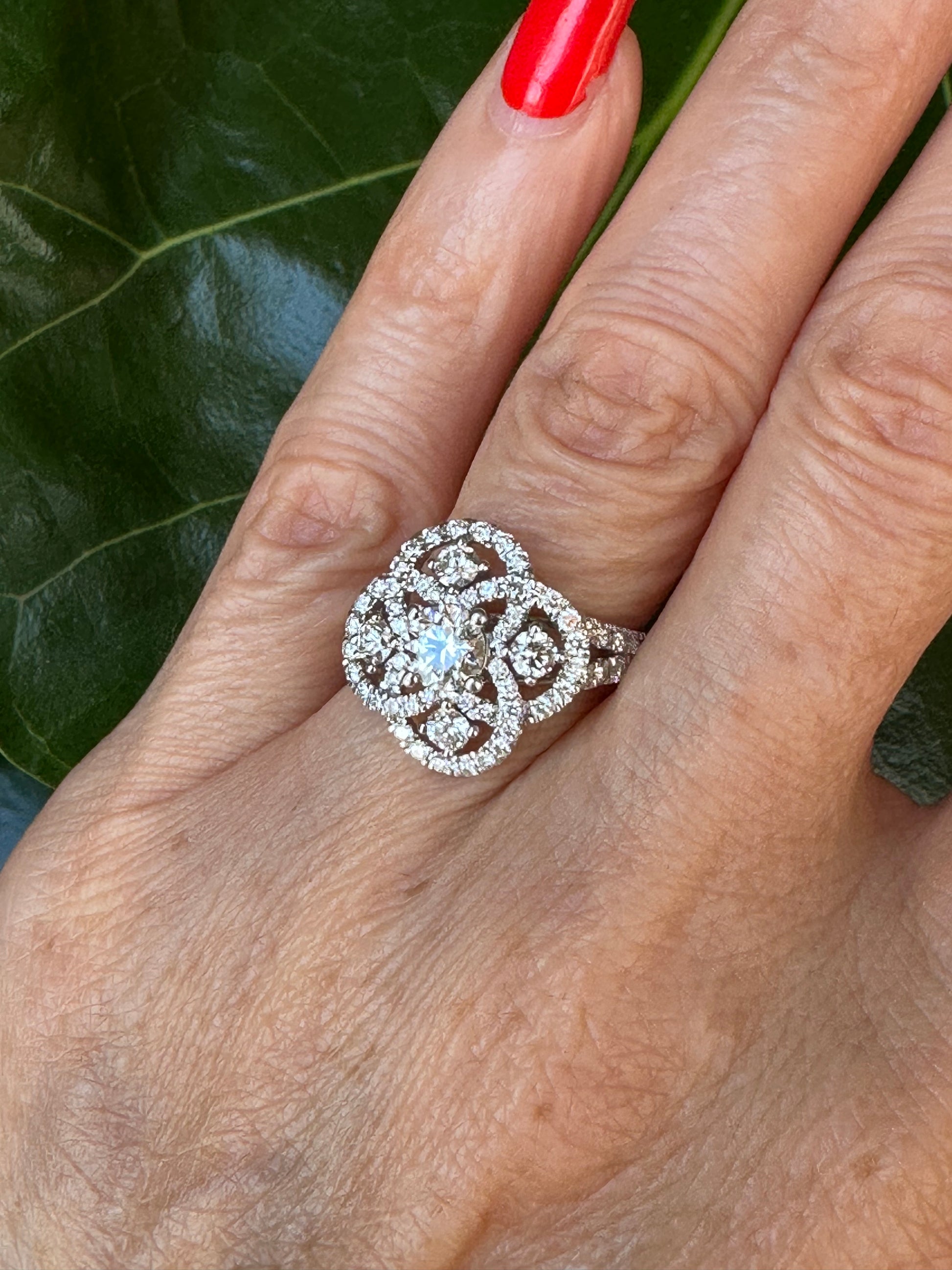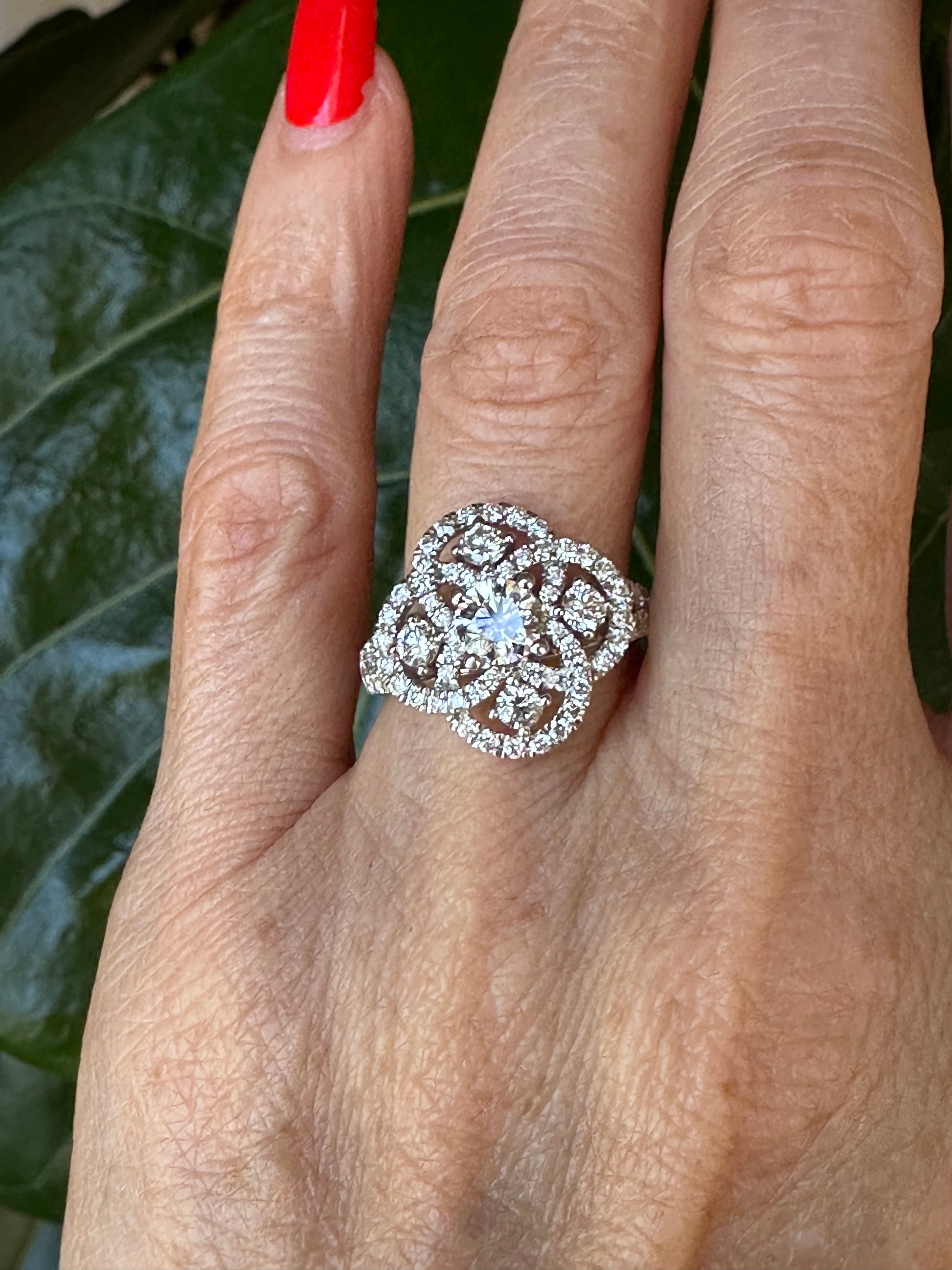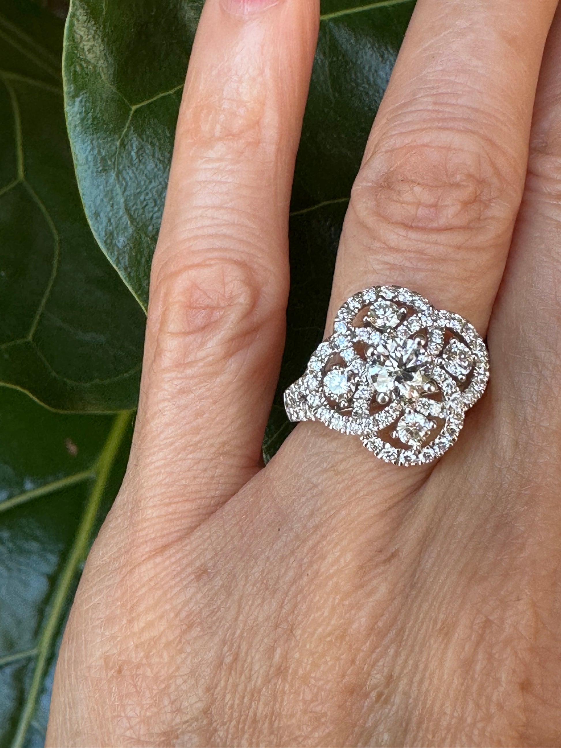 Elevate any occasion with our Natural Diamond Cocktail Ring in White Gold. Its beautiful design features 5 visible diamonds and diamond swirls, adding elegance to any look. Made to last for generations, this stylish ring boasts a white gold mounting finishing with diamond shoulders on the ring. Enhance your collection with this timeless piece.