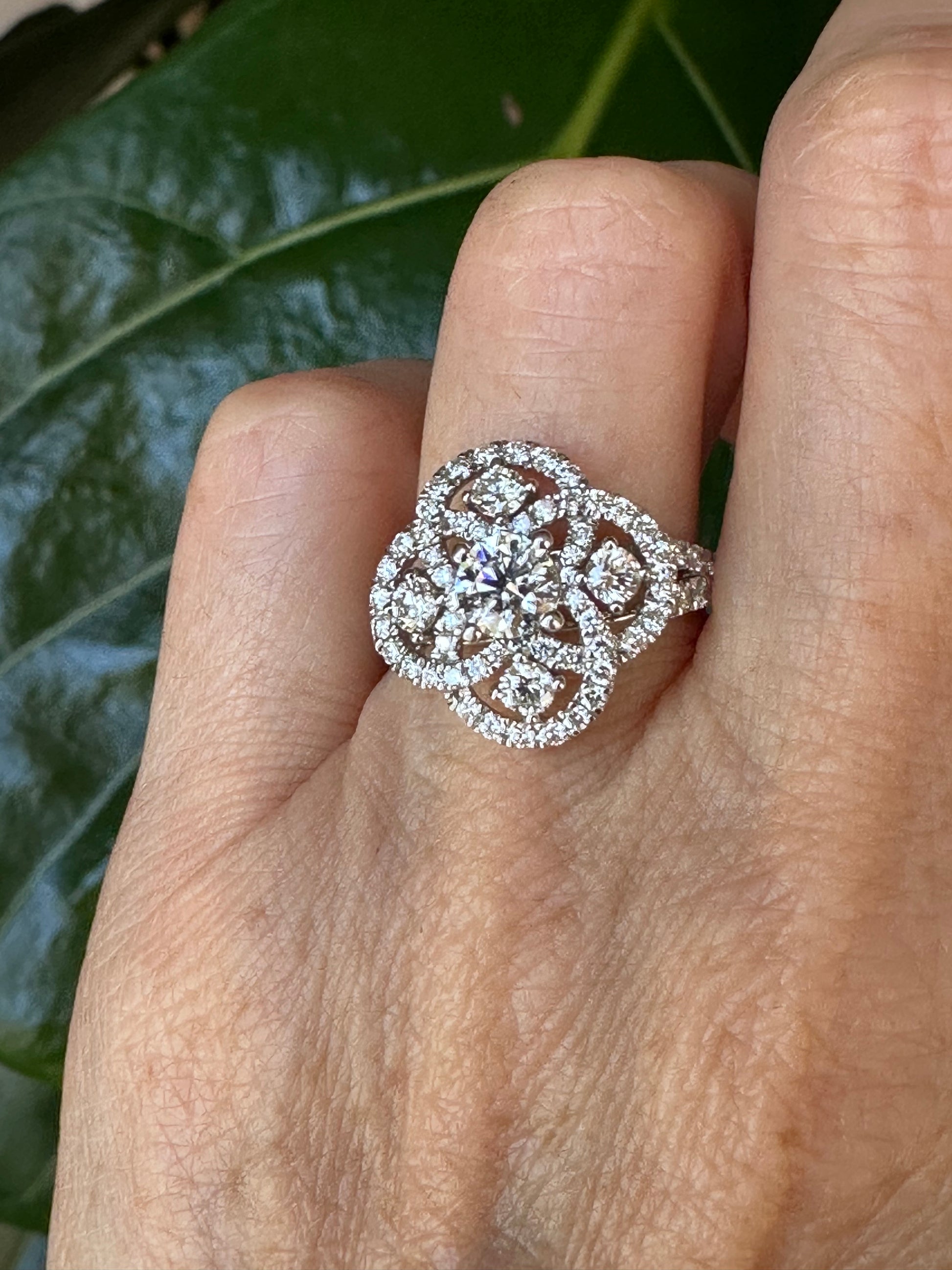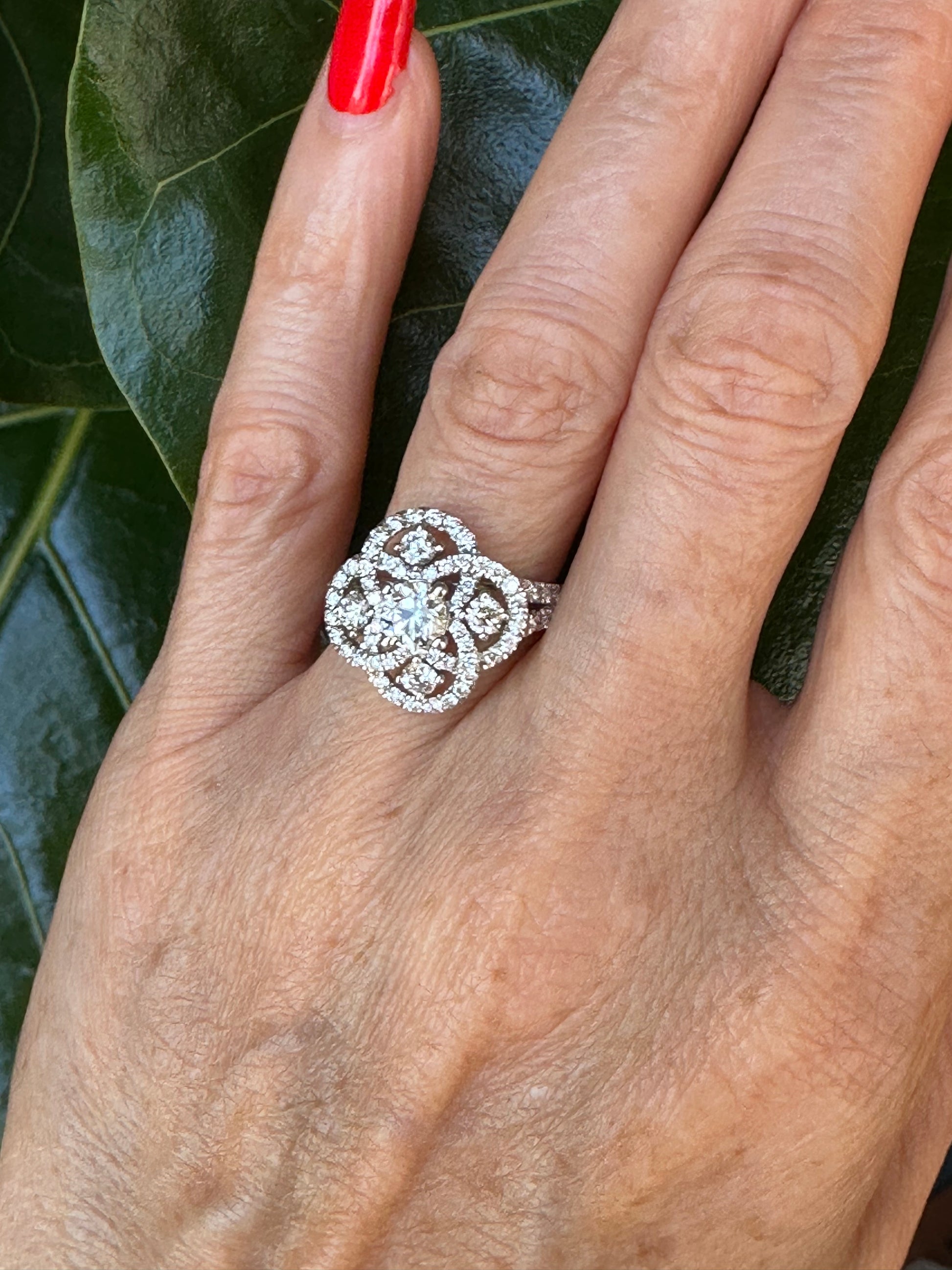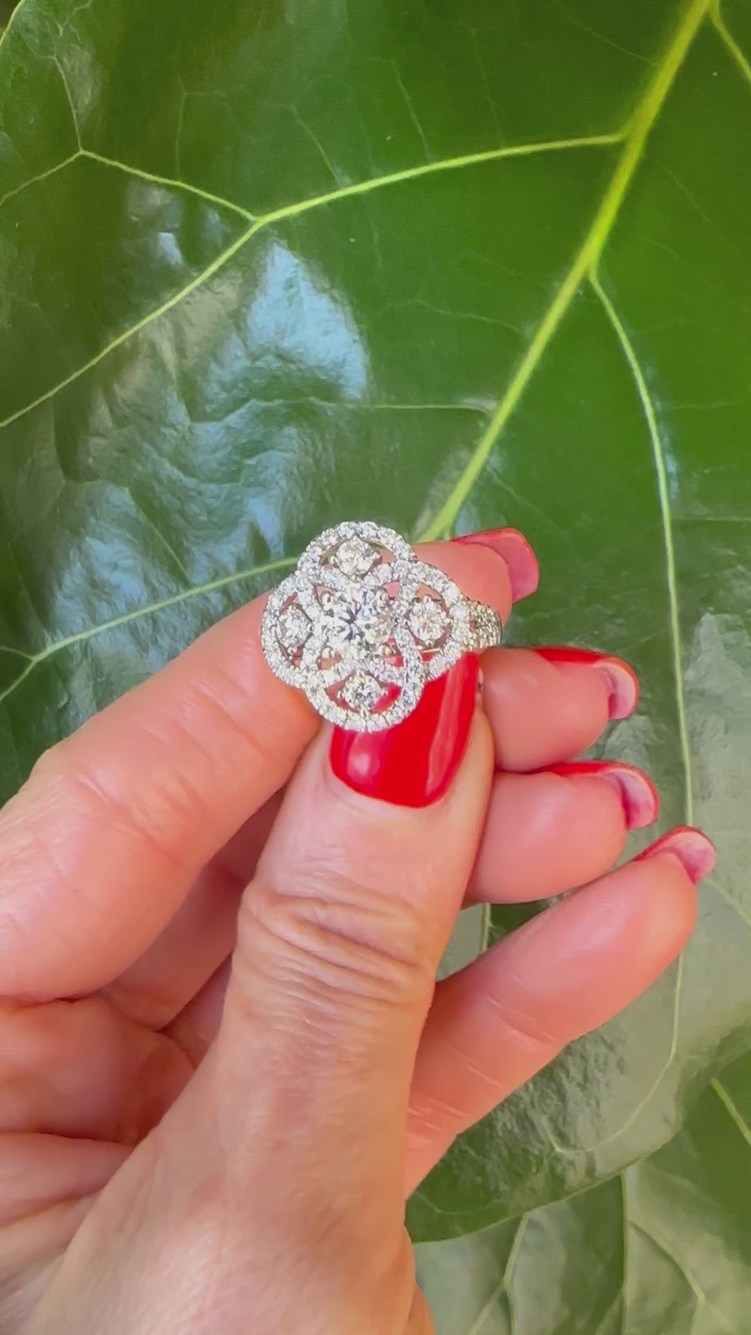 Elevate any occasion with our Natural Diamond Cocktail Ring in White Gold. Its beautiful design features 5 visible diamonds and diamond swirls, adding elegance to any look. Made to last for generations, this stylish ring boasts a white gold mounting finishing with diamond shoulders on the ring. Enhance your collection with this timeless piece.