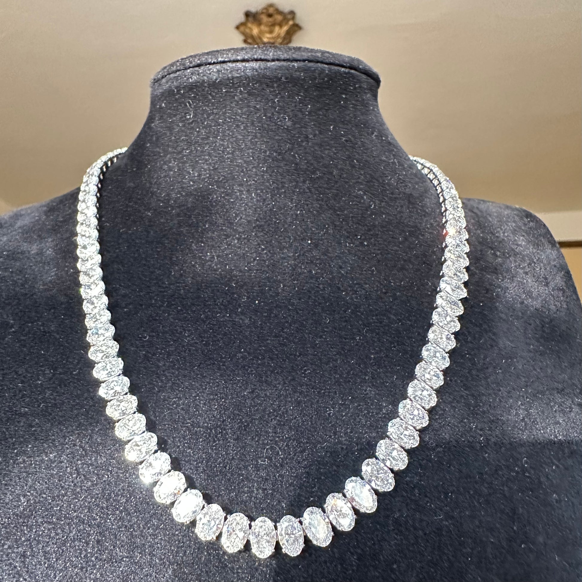 This exquisite 16-inch tennis necklace features 83 oval cut natural diamonds, totaling 41.61 carats, each approximately 0.50 carats with E, F, and G color grading and Si1-Si2 clarity. Crafted in 18k white gold weighing 39.30 grams, every stone is GIA certified, ensuring superior quality and authenticity. A timeless piece that elevates any occasion, this necklace is a sophisticated addition to any jewelry collection and an ideal choice for weddings or holiday gifting.