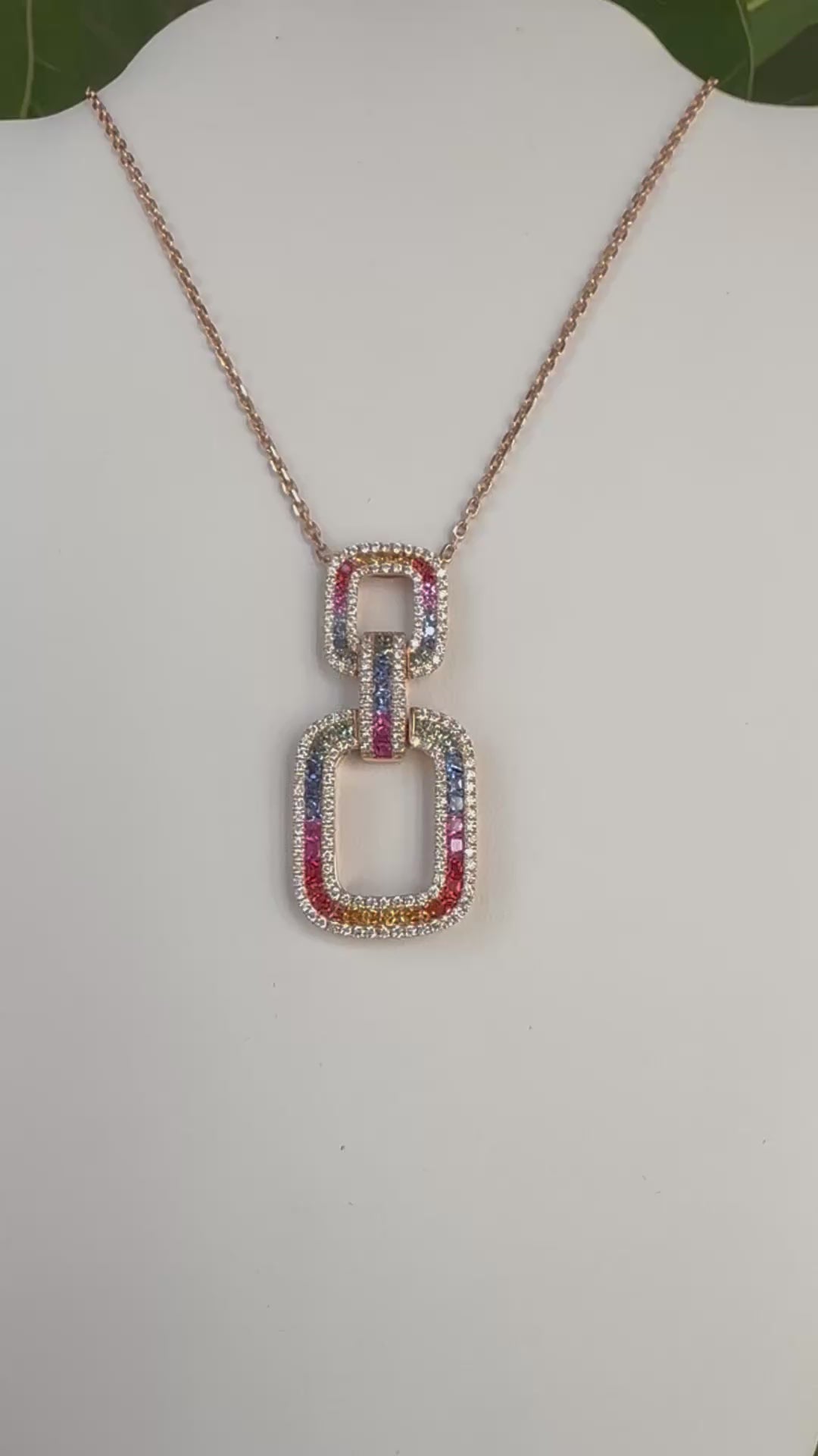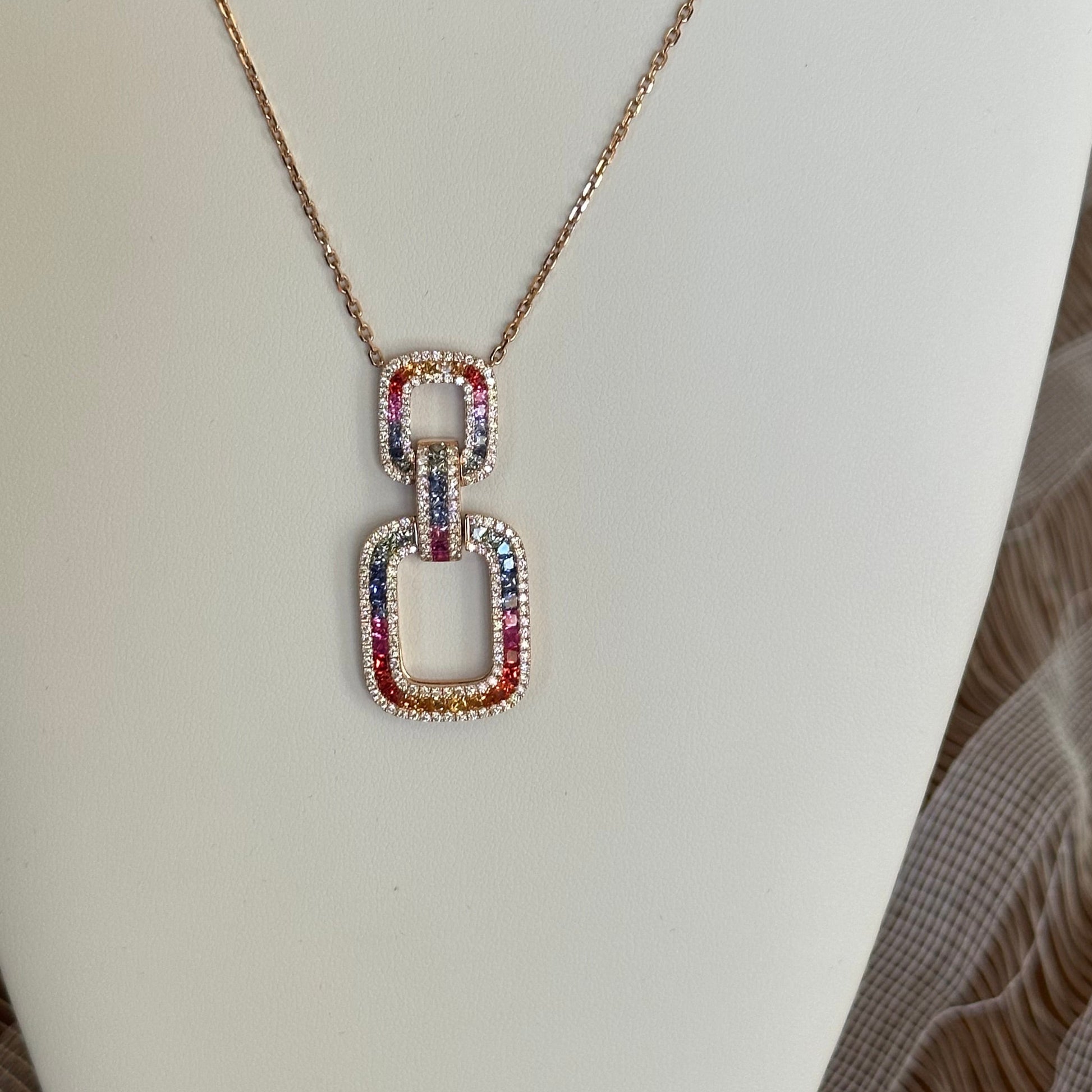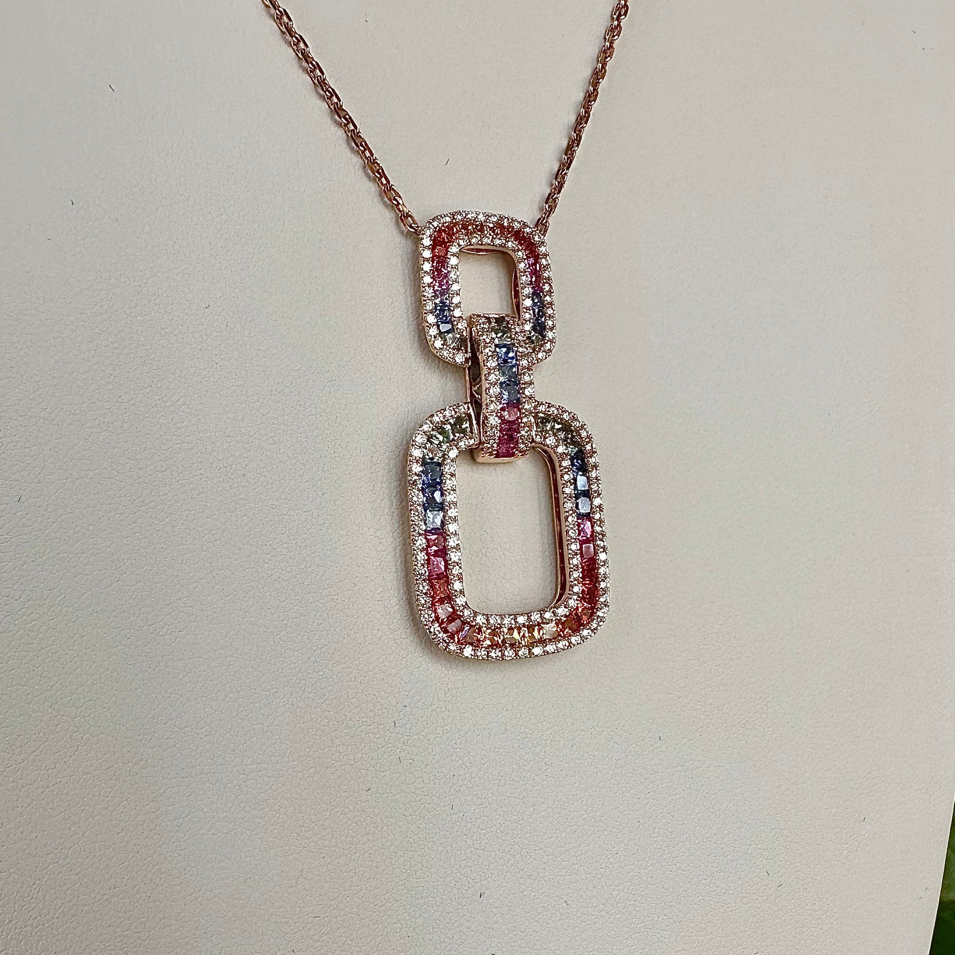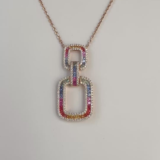 Discover the captivating allure of this Rainbow Sapphire & Diamond Interlocking Rectangular Pendant. Each natural sapphire showcases a mesmerizing spectrum of colors, meticulously arranged to create a harmonious gradient effect. Encircled by a luminous halo of natural diamonds, this pendant achieves a sophisticated balance of color and brilliance. Crafted in 18k rose gold, the interlocking rectangular design offers both contemporary elegance and enduring durability. A truly distinctive piece that celebrates the natural beauty of gemstones while maintaining the timeless appeal of fine jewelry.
