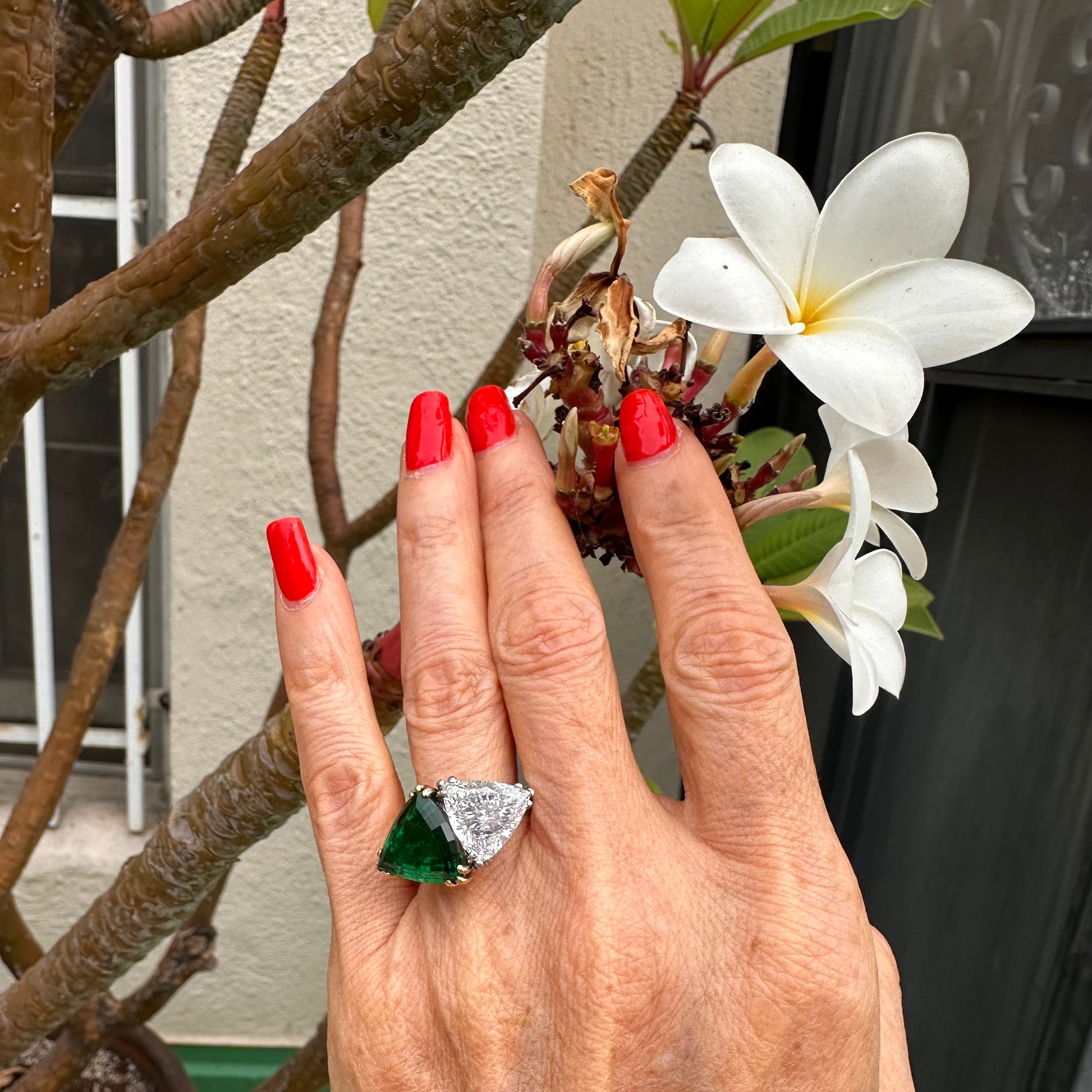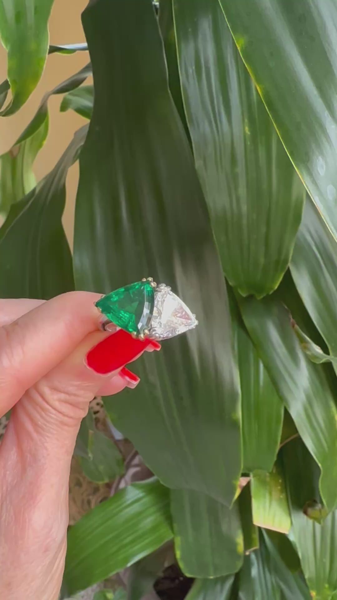 This exquisite ring features a Zambian emerald in a triangular step cut, perfectly showcasing its vibrant color and clarity. Complemented by a modified triangular brilliant cut diamond, it highlights the stone’s internal fire with exceptional brilliance. Both gemstones come with GIA certificates, ensuring their authenticity and quality. Crafted in a popular setting, this elegant piece is ideal for anniversary gifts, wedding jewelry, or as a meaningful present for May birthdays. Its expert design balances sophistication and timeless beauty, making it a standout addition to any collection.