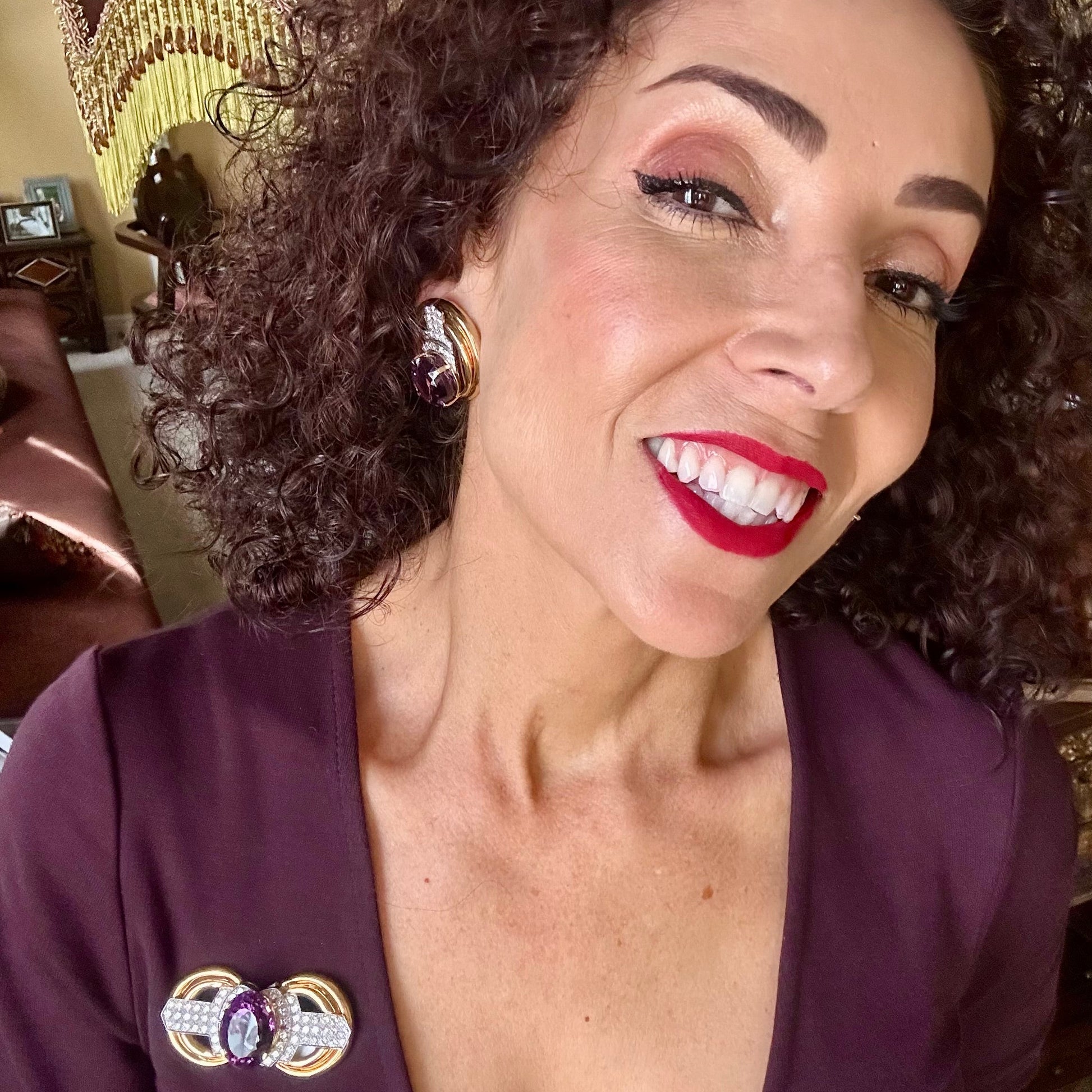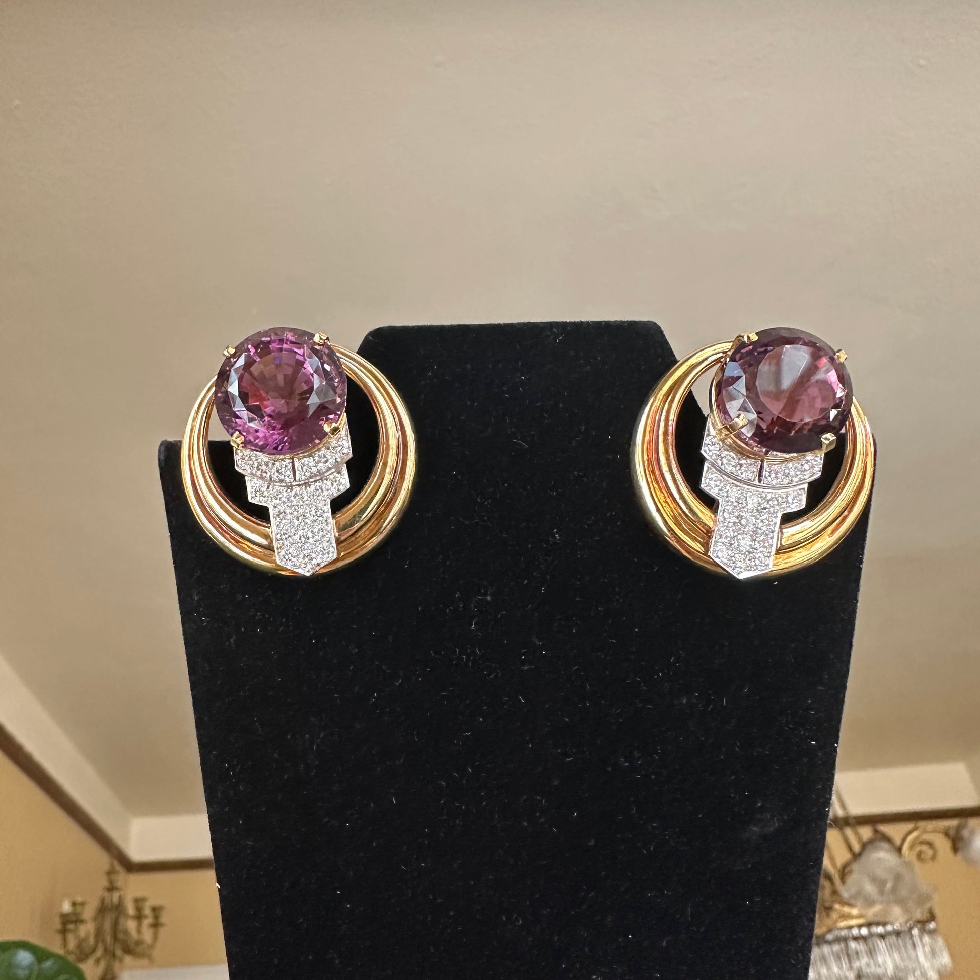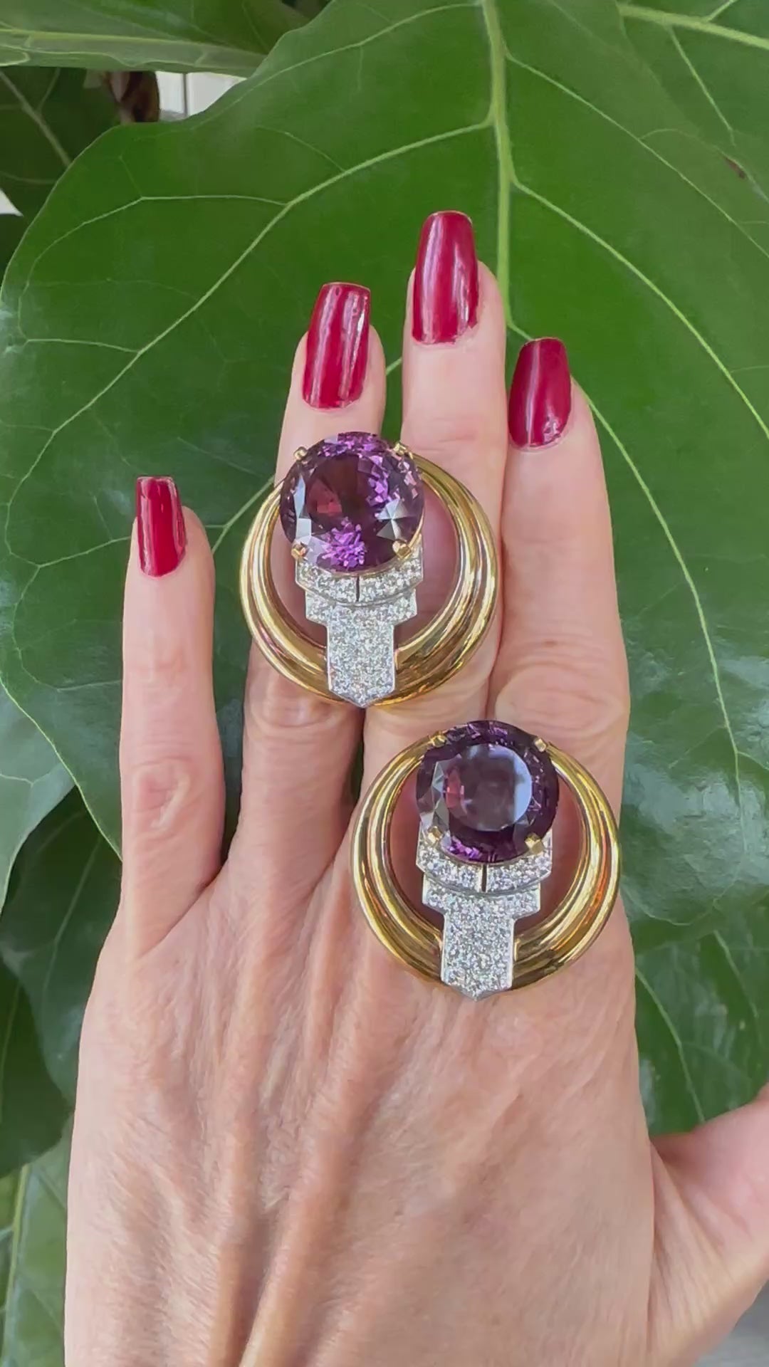 Exquisite vintage earrings showcasing stunning violet amethysts with subtle red undertones, paired with brilliant-cut diamonds of exceptional clarity. Crafted in 18k yellow gold and platinum, these pieces exemplify timeless design with meticulous attention to detail. Secured with omega backs or French clips for reliable wear, each earring bears hallmarks and an elegant "E" stamp, attesting to their quality craftsmanship. A sophisticated addition to any fine jewelry collection, these earrings capture the elegance of classic design without the premium of a signature house.