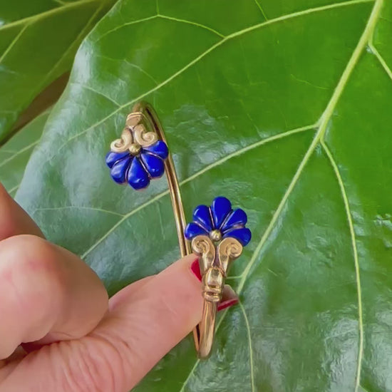 This exquisite vintage cuff showcases intricately carved lapis lazuli with a striking floral motif at its center, complemented by 18k yellow gold accents that enhance the design's sophistication. Inspired by 1960s craftsmanship, this open bangle exemplifies the superior quality and enduring artistry of vintage jewelry—a testament to materials and techniques that surpass contemporary standards. The piece's versatile design makes it ideal for stacking or wearing alone, offering timeless elegance for collectors and those who appreciate refined, delicate jewelry with genuine character and rarity.