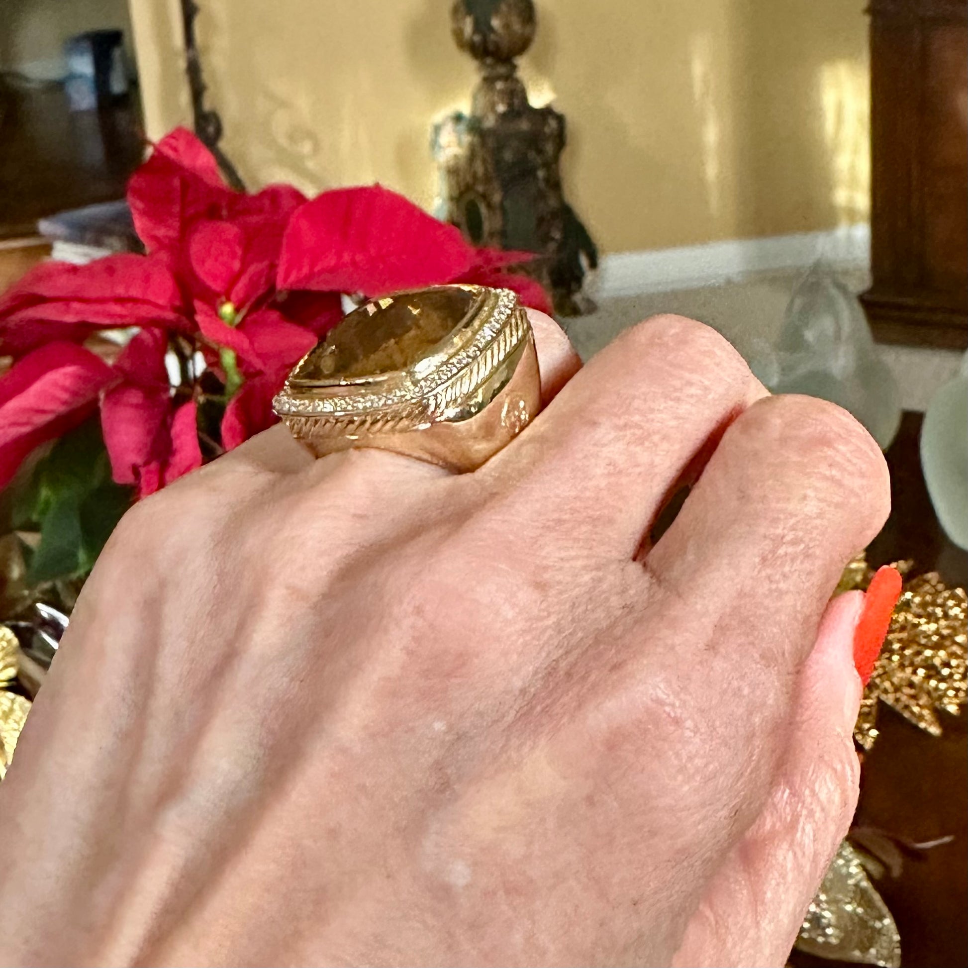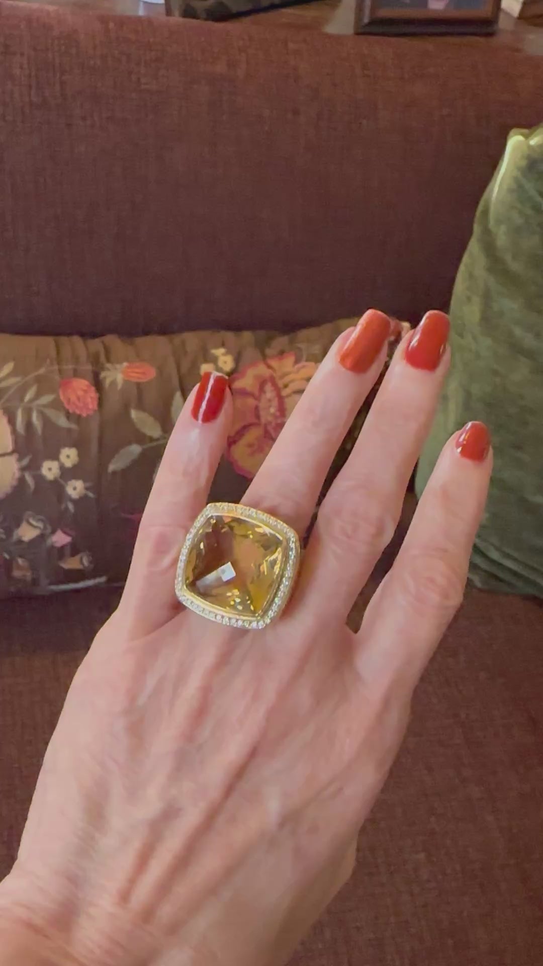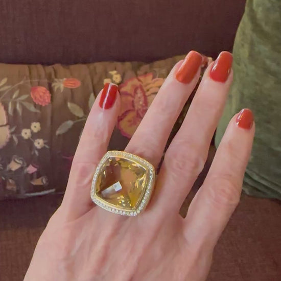 This stunning Vintage David Yurman Albion Collection Citrine & Diamond Ring is a true showstopper. With approximately 25 carats of crosscut cushion vivid citrine and an additional .50 carats of round brilliant cut diamonds, this ring will catch the eye of everyone in the room. Made with fine solid 18k yellow gold, it is the perfect accessory for any special occasion. Treat yourself this holiday season and add this impressive cocktail ring to your collection.