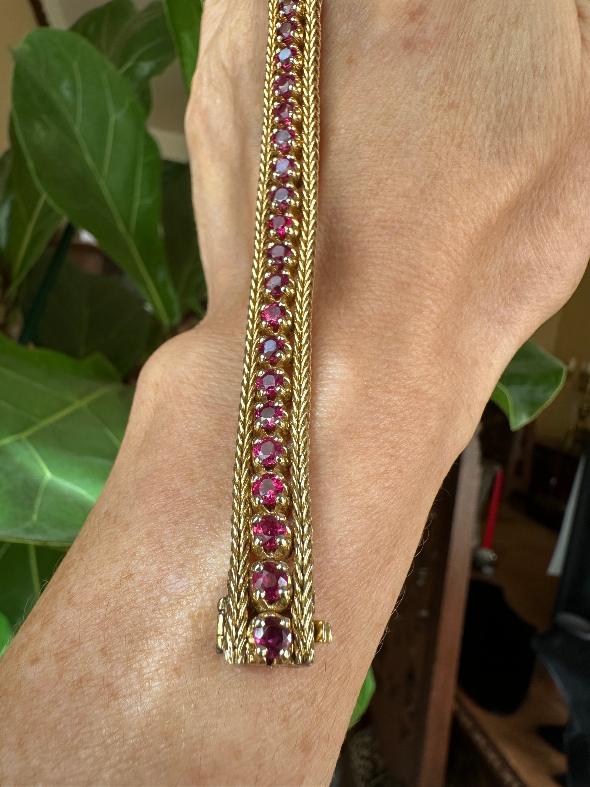 This handcrafted vintage-inspired tennis bracelet showcases 35 deep raspberry rubies set in a refined wheat link design that celebrates the gemstones' natural beauty. Crafted in 14k yellow gold, the subtle gold detailing frames each ruby without overwhelming them, creating a sophisticated alternative to conventional tennis bracelets. The meticulous artisanal construction ensures each stone is secured with precision, while the elegant wheat pattern adds dimension and movement to the piece. A timeless investment that transcends trends, this ruby bracelet combines classic design with distinctive character—perfect for those who appreciate genuine craftsmanship and distinctive gemstone jewelry.