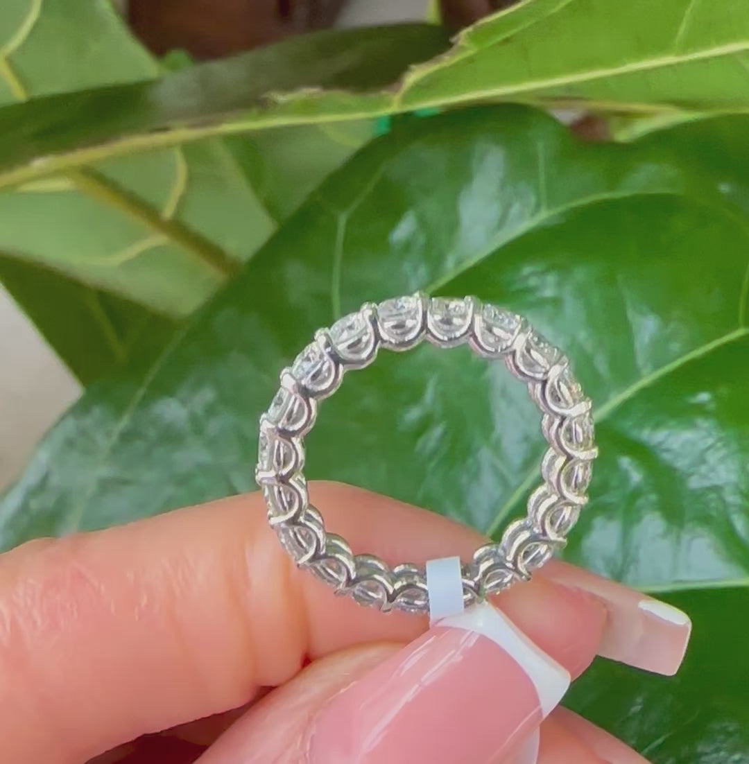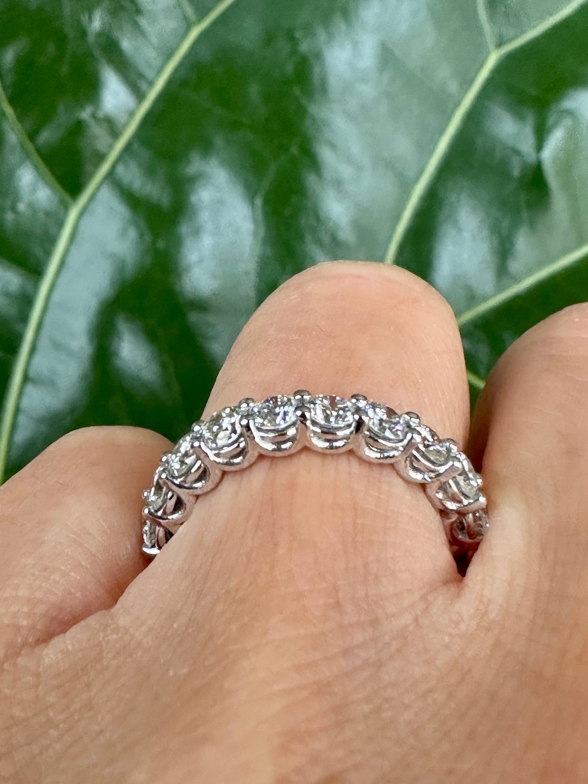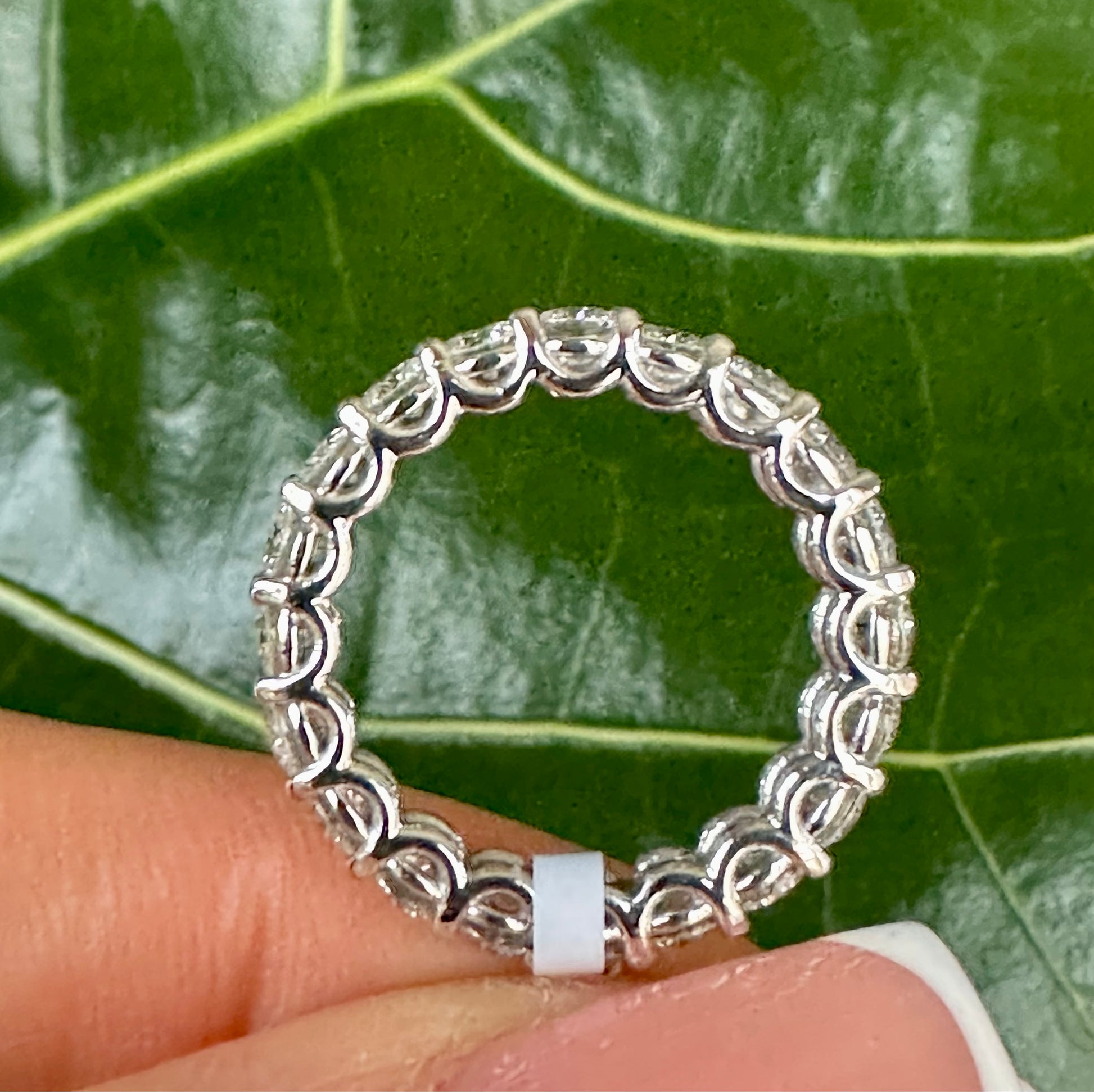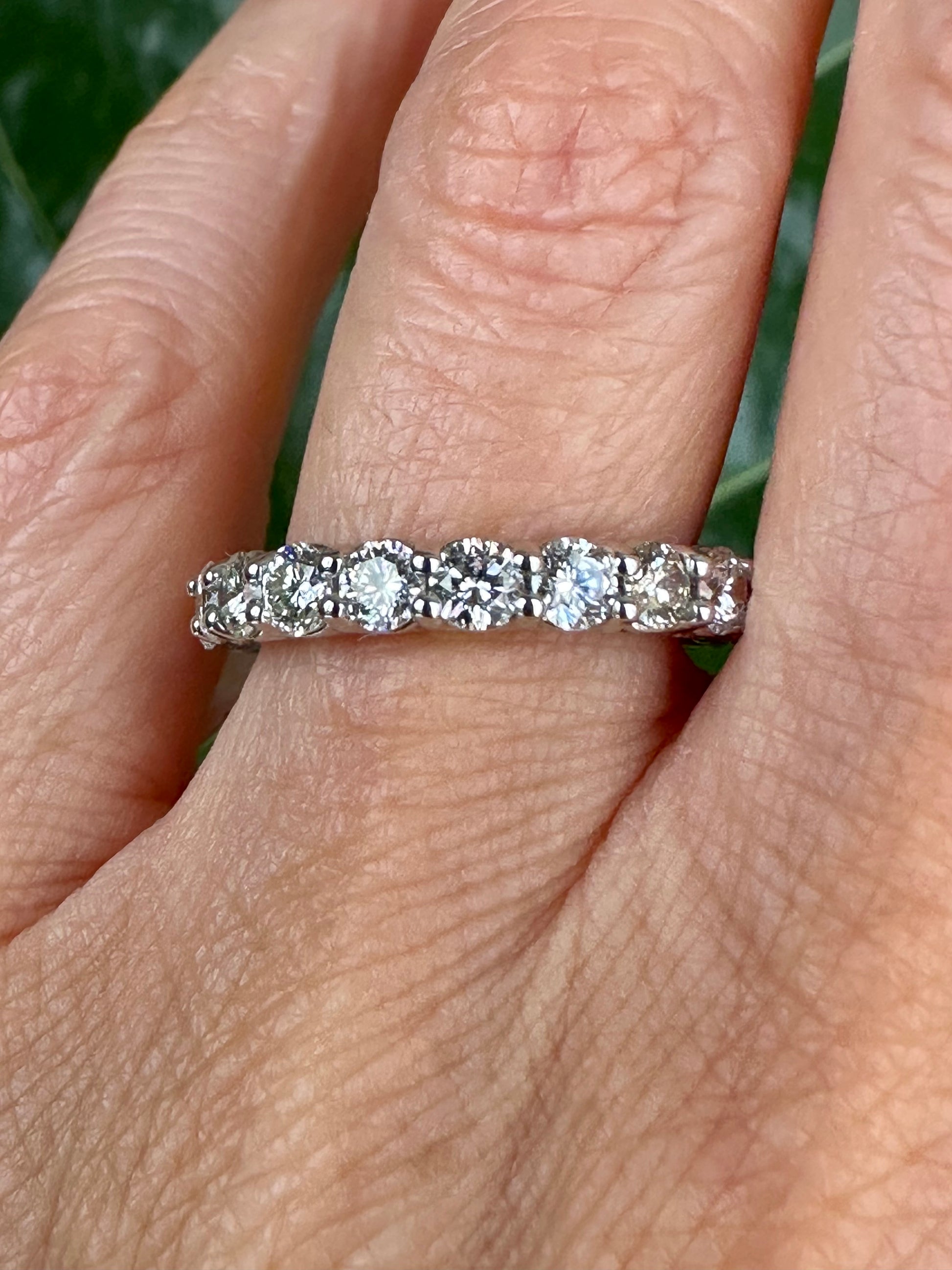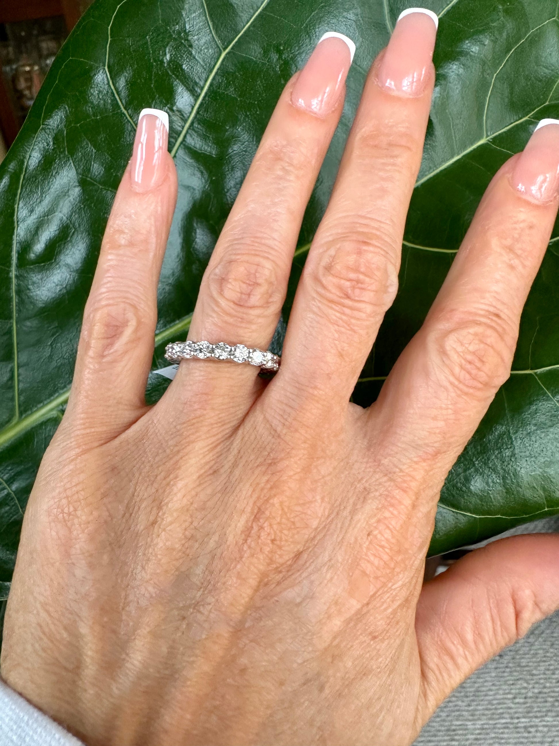 This 18k white gold eternity band features natural diamonds, the must-have accessory for anyone seeking elegance and timeless style. Crafted with quality in mind, this band is the perfect addition to any jewelry collection. Let the natural diamonds add a touch of luxury to your everyday look.